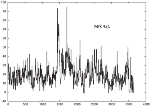 Первое, что бросается в глаза, блазар — вспыхивающий источник (это относится не только к данному объекту). В паузах между эпизодами активности (интервал 1200–1600 дней) источник практически исчез. На глаз видны по меньшей мере три масштаба переменности: два-три года — периоды активности и затишья, один-два месяца — максимумы активности и дни — высокие узкие пики. Годы вполне можно объяснить нестабильностью режима аккреции. Месяцы — тоже скорее какими-то неустойчивостями в аккреционном диске. А с переменностью в дни, даже в день — время фронта нарастания самой яркой короткой вспышки — всё сложнее.
