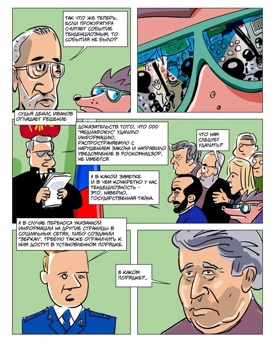 Если генеральный прокурор посчитал опасной для общества какую-то из публикаций раздела по Болотной, например, сообщающую о том, где и когда будет очередное заседание по одному из дел, входящих в этот блок по Болотной, то напрашивается единственный вывод: значит, прокурор считает, что наблюдение за открытым судебным процессом, присутствие публики и журналистов в открытом судебном процессе в российском суде приравнивается к мероприятиям, проводим с нарушением закона, как условно несанкционированная демонстрация или митинг.