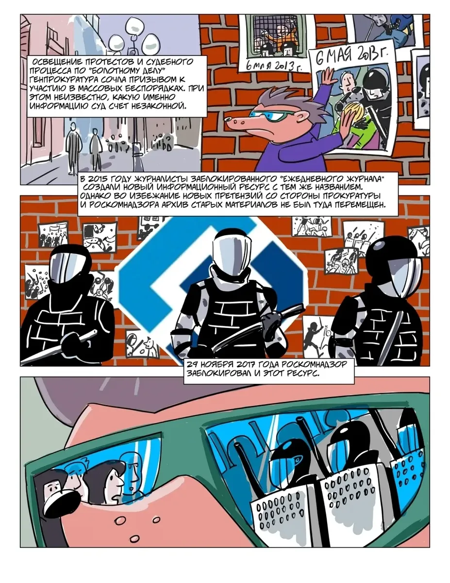 Почему-то, когда блокируется сайт во внесудебном порядке, Генеральная прокуратура не говорит, из-за какой публикации заблокирован сайт. А раз они не говорят об этом, соответственно, владелец сайта и не может удалить эту публикацию, чтобы открылась дверь и он мог бы разблокировать сайт. Соответственно, вся риторика была бы на уровне «Ваш сайт тенденциозный», «Там много критики», «Болотная»… Один раз представитель Генпрокуратуры в кулуарах сказала, что «Ну... это из-за совокупности публикаций и общей направленности сайта». Второй раз мне намекнули, что это из-за раздела по Болотной.