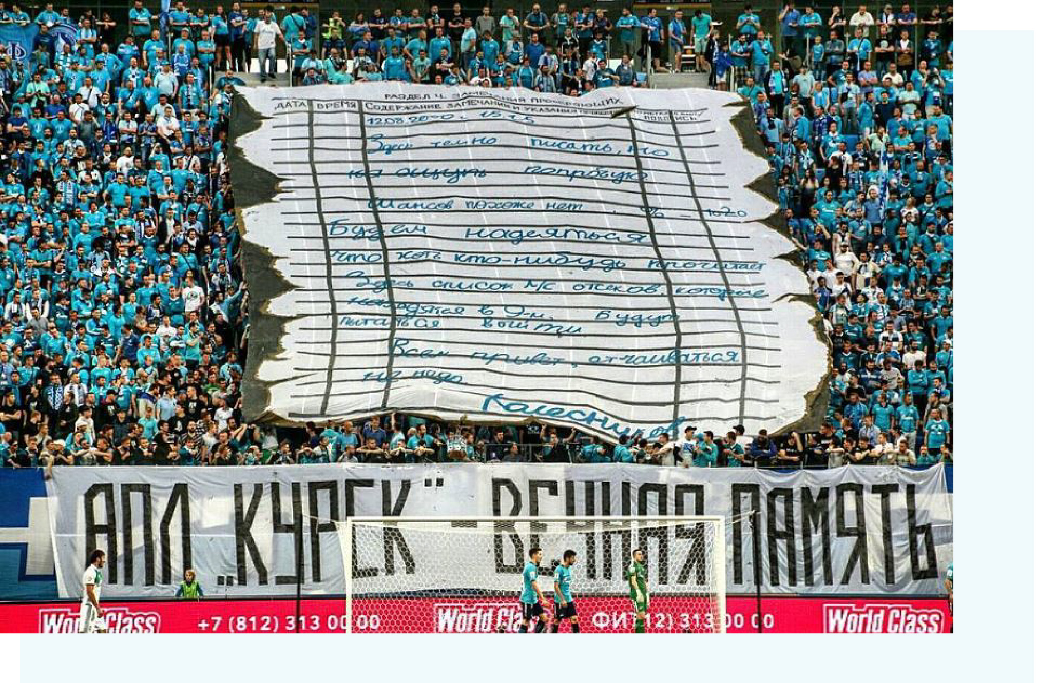 Другая акция сезона 2017/2018 — памяти погибших моряков «Курска» на августовском матче с «Ахматом». Баннер выполнили в виде письма командира подлодки Дмитрия Колесникова, которое тот написал перед смертью. В письме Колесникова, текст которого болельщики перенесли на баннер, сказано: «15:45. Здесь темно писать, но на ощупь попробую… Шансов, похоже, нет. Процентов 10–20. Будем надеяться, что хоть кто-нибудь прочитает. Здесь списки личного состава отсеков, некоторые находятся в девятом и будут пытаться выйти. Всем привет, отчаиваться не надо». Фанаты почтили память погибших моряков минутой молчания и исполнили песню «Там за туманами» группы «Любэ».