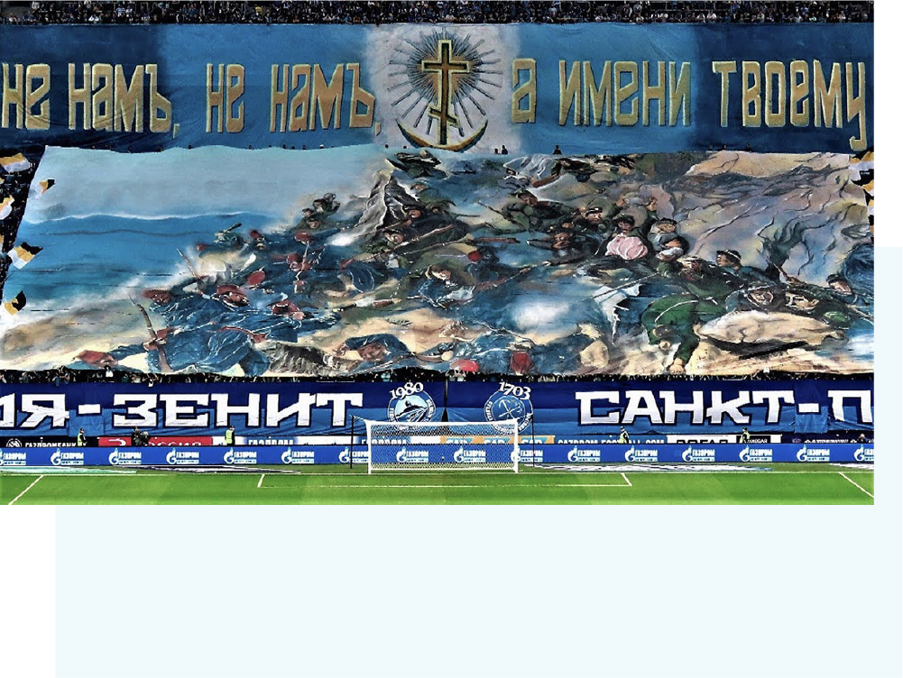 Еще одна важная для активной части фанатов тема — православие. Болельщики неоднократно обращались к ней в своих акциях. Например, в 2016 году на матче с ЦСКА фанаты растянули гигантский баннер «За „Зенит“, за Родину, за Веру», а год спустя — уже на матче со «Спартаком» — на Вираже появился портрет Александра Невского с надписью «Да прибудет с нами вера, правда и сила» (слово «пребудет» было написано с ошибкой).