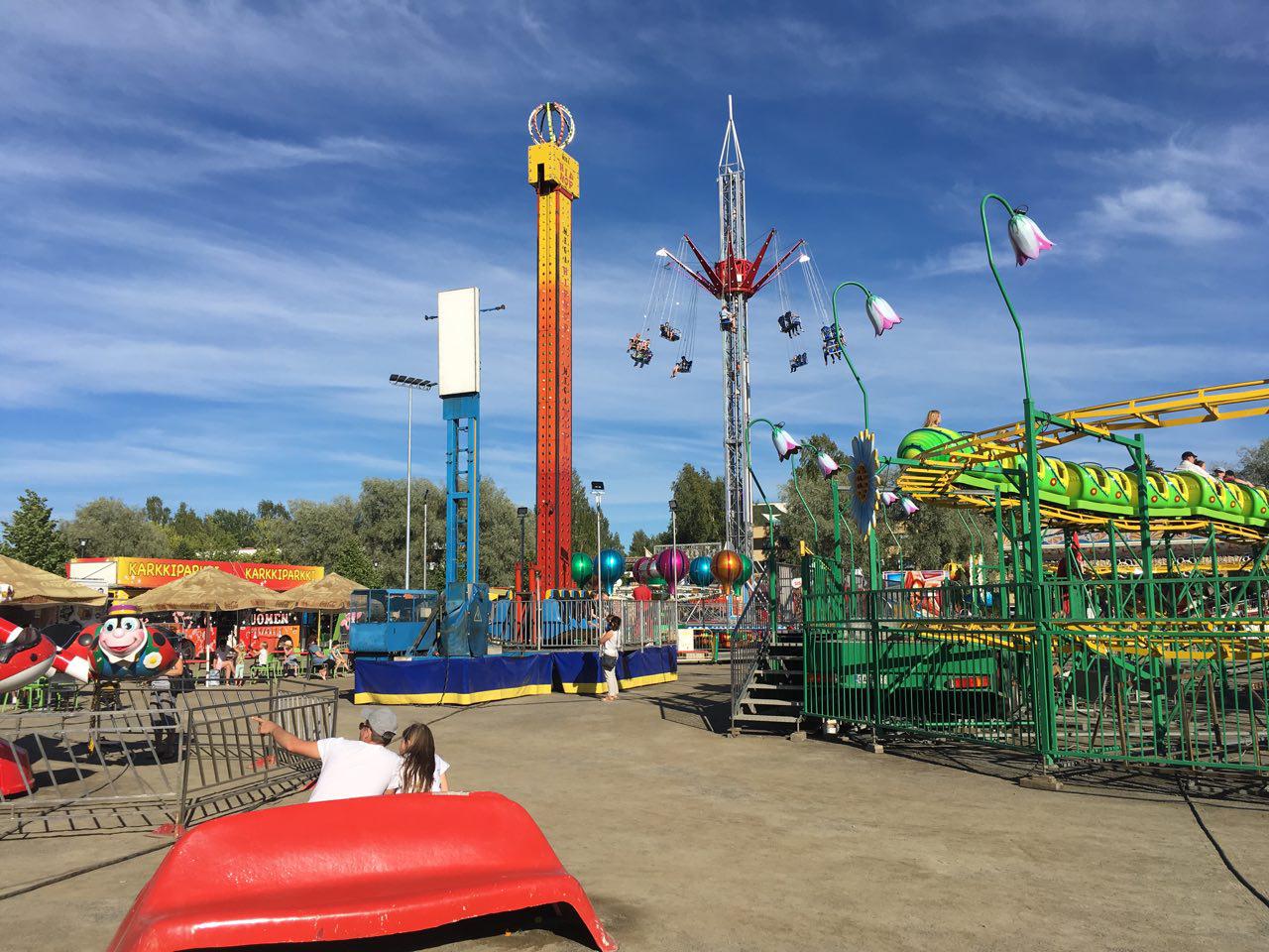 Но в нашей новой жизни нет ни дачи, ни друзей (пока): есть только мы и дети. Поэтому мы решили, что наши первые финские выходные должны быть запоминающимися, но не утомительными. Воскресенье прошло под накрапывающий дождик и ароматы рагу, блинов, арбуза, заполонившие квартиру (стал ли арбуз запоминающимся, но не утомительным, узнаем к утру). А вот суббота была ударно-адреналиновая: мы ходили в приехавший в Йоэнсуу лунапарк.