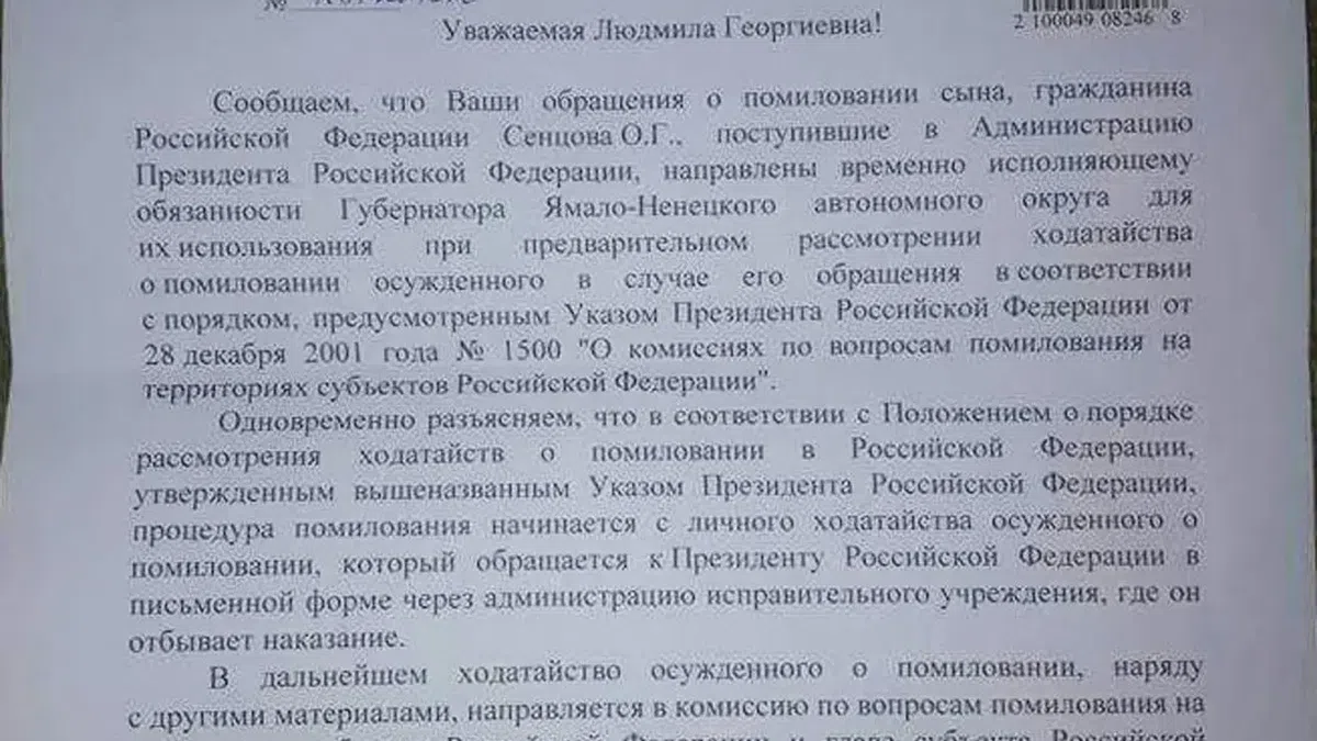 В администрации президента также отметили, что просьба матери Олега Людмилы Сенцовой направили временно исполняющему обязанности губернатора Ямало-Ненецкого округа для его предварительного рассмотрения.