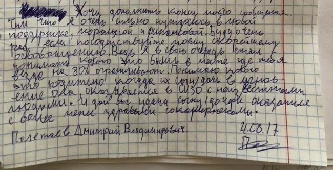 «ОВД-Инфо» с разрешения матери опубликовали только фрагмент письма. Оно датировано 4 августа. Союз солидарности с политзаключенными 16 августа объявил о начале сбора денег на помощь обвиняемым по делу «Нового величия».