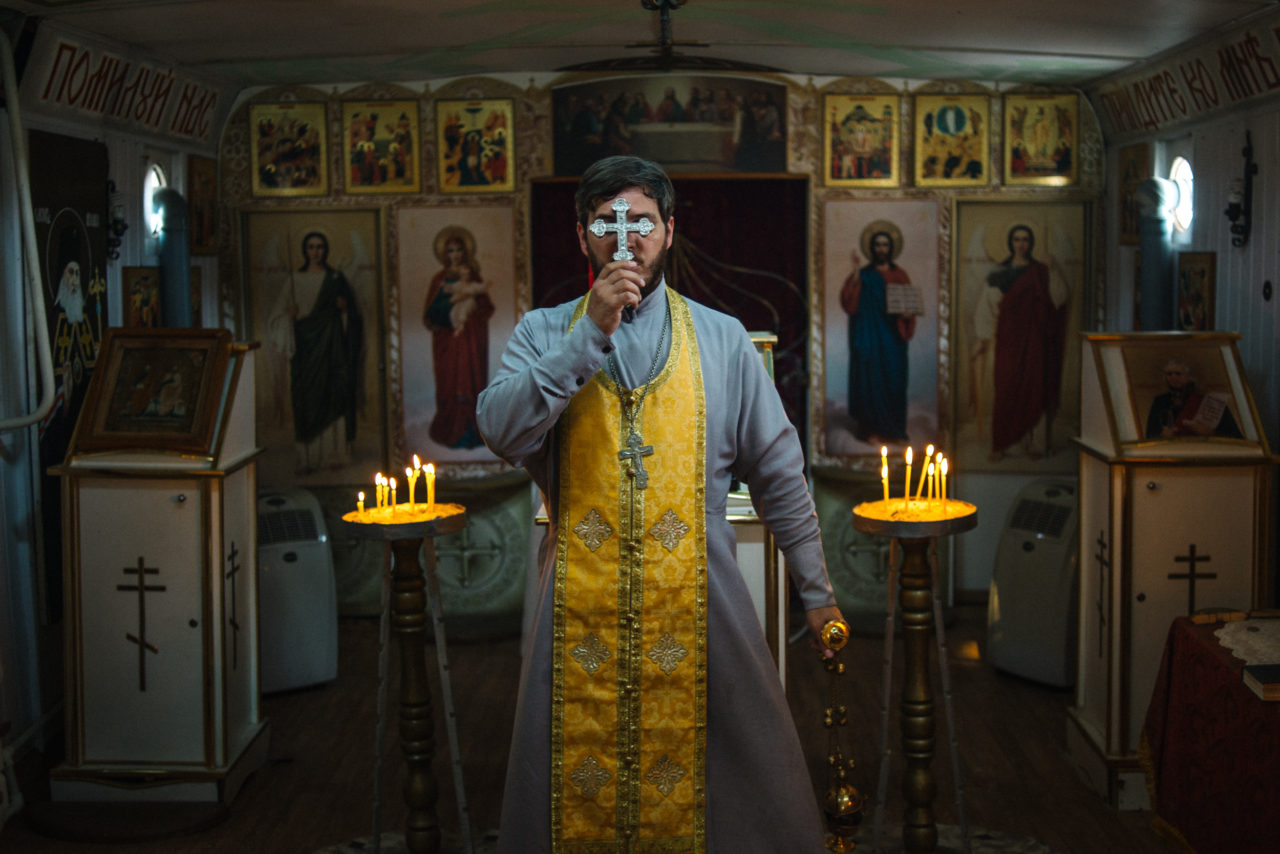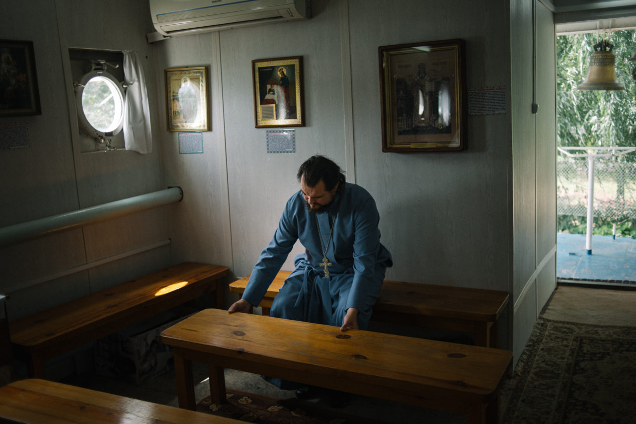 — Построили его в 2000 году, и с тех пор здесь менялись священники, я пятый. Как раз когда храм приплывал в поселок, я служил офицером в нашем военном городке. Потом уехал и вернулся сюда в 2015 году уже в статусе священника. Храм и раньше стоял в этом затончике, а потом его решили поднять на берег, потому что возникла угроза подтопления. И этот храм, и тот, что в Пятиморске, были построены на базе старых списанных судов. В Пятиморске внешний вид баржи сохранили — приделали купол и все. А здесь весь верх срезали, оставили только платформу под храм. Со временем он начал крениться, основание прогнило. Все уже поняли, что храм не будет ходить, и в 2008 году его спешно эвакуировали на берег: подняли, подержали, чтобы вода слилась, и поставили на шпалы. Он уже плавать никогда не будет, теперь он приходской, так что мы его расширили.
