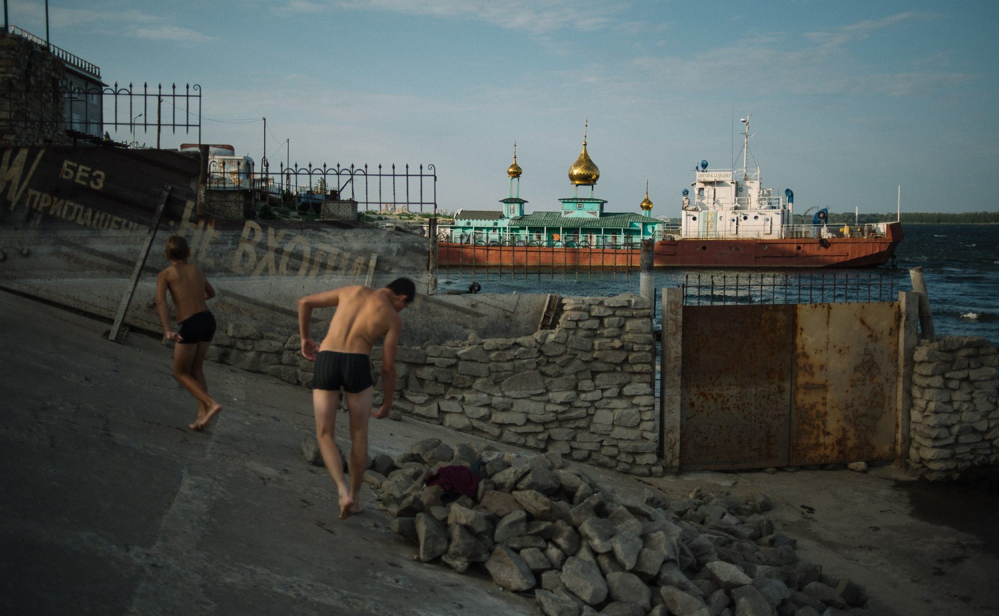 Волгоград, жара под сорок градусов, набережная. У воды расхаживают загорелые пляжники, с небольшого мола прыгает в Волгу компания ребят. Эти речные дети прыгают «щучкой», а не «рыбкой», как это принято на море. За молом пришвартован храм «Святой Владимир». Он стоит на закрытой территории яхт-клуба, и мальчишкам остается только вздыхать и обсуждать, как было бы здорово «щучкой» с храма.