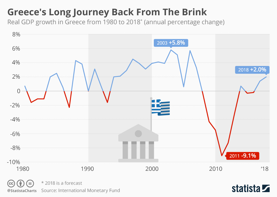 • За время финансового оздоровления греческая экономика сократилась на 28% и только сейчас начинает показывать признаки восстановления – за прошлый год ВВП страны вырос на 1,4% – это первый значимый рост с 2007 года, прогноз на этот год – около 2%.