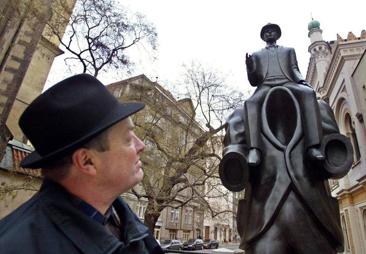 Одному из таких коренных жителей Праги пришлось забраться на странную гигантскую конструкцию из бронзы и стали, чтобы обозревать происходящие в его родном городе метаморфозы с иронической улыбкой. Имя этого горожанина — Франц Кафка. Я имею в виду не реального автора «Превращения» и «Процесса», а его скульптурное воплощение — в виде вполне реалистической фигуры в костюме, в туфлях и в шляпе; но сидит этот бронзовый Кафка на четырехметровом гиганте из стали с дырой там, где у нормального человека располагаются легкие и сердце. Этот памятник воздвигнут вполне мультикультурно между костелом Св. Духа, древней Испанской синагогой и туристским Музеем еврейской истории. Рядом жил Кафка. В тяжелый знойный день, отправившись на поиски дома Кафки, я был настолько ошарашен загадочной постмодернистской символикой и гигантоманией этого монумента, что от неожиданности присел на соседнюю лавочку. Металл этого монстра зловеще отсвечивал на солнце. Пока я приходил в себя, я услышал чуть ли не дюжину разгадок символической тайны этого монумента. Разъяснения и интерпретации на разных языках исходили от гидов, водивших по Праге туристические группы из разных стран. Я узнал массу нового и необычного о личности Франца Кафки, о его жизни и творчестве.