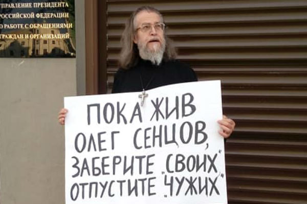 Одиночные пикеты в поддержку Сенцова также прошли у администрации президента. В акции участвовал священник Яков Кротов.