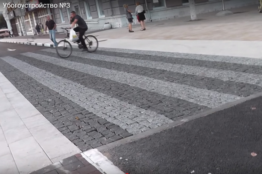 Телунц рассказал о трех пешеходных переходах, один из которых появился при реконструкции — это переход с площади Ленина на пешеходную улицу Почтовую. Он широкий и удобный в том плане, что нет высоких бордюров, но точно так же небрежно замощен «разъезжающимися» кирпичами. Второй пешеходный переход находится с другой стороны площади, на улице Краснорядской. Телунц обратил внимание на его удобство: на тротуарах и бордюрах сделаны углубления, что позволяет велосипедистам, мамам с колясками и маломобильным инвалидам свободно по нему передвигаться. На третьем переходе на улице Соборной, по словам Телунца, «креатив закончился»: на одной стороне бордюра нет, и это удобно, на другой стороне он есть, и довольно высокий.