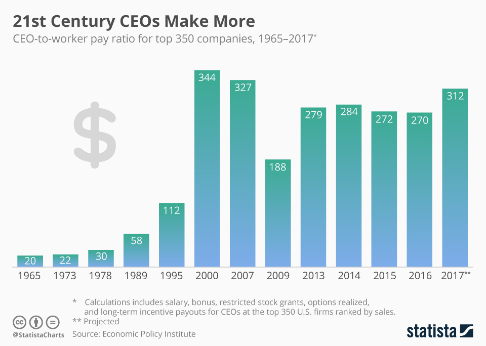 В 2017 году СЕО 350 крупнейших американских компаний в среднем заработали (при подсчете учитывались и зарплата, и всевозможные бонусы и премии) в 312 раз больше, чем их сотрудники. В некоторых случаях разрыв гораздо больше: руководитель McDonald's Стивен Истербрук в прошлом году получил $21,8 млн — в 3000 с лишним раз больше, чем в среднем сотрудники его компании ($7000). Пик в разрыве зарплат между руководителями и подчиненными пришелся на начало 21 века – в период с 1978 по 2000 год доходы CEO выросли на 1200% — тогда CEO в среднем зарабатывали в 344 раза больше собственных сотрудников, сильное падение произошло после кризисного 2008 года. Впрочем, замечает Bloomberg, в США сейчас гораздо больше внимание уделяется гендерному разрыву между зарплатами — мужчины в среднем получают на 20% больше, чем женщины.