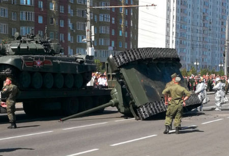 "23 августа около 12:10 мск в г. Курск после завершения парада при погрузке на трал танк Т-34 съехал с платформы и перевернулся. Механик-водитель танка не пострадал. Ремонтное подразделение, прибывшее на место, оперативно погрузило танк на трал, после чего бронемашина была доставлена в пункт дислокации", - говорится в сообщении пресс-службы. (