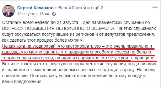 Оказалось, что депутат Госдумы Сергей Казанков сравнил пенсионеров с котами, которых будут кастрировать.