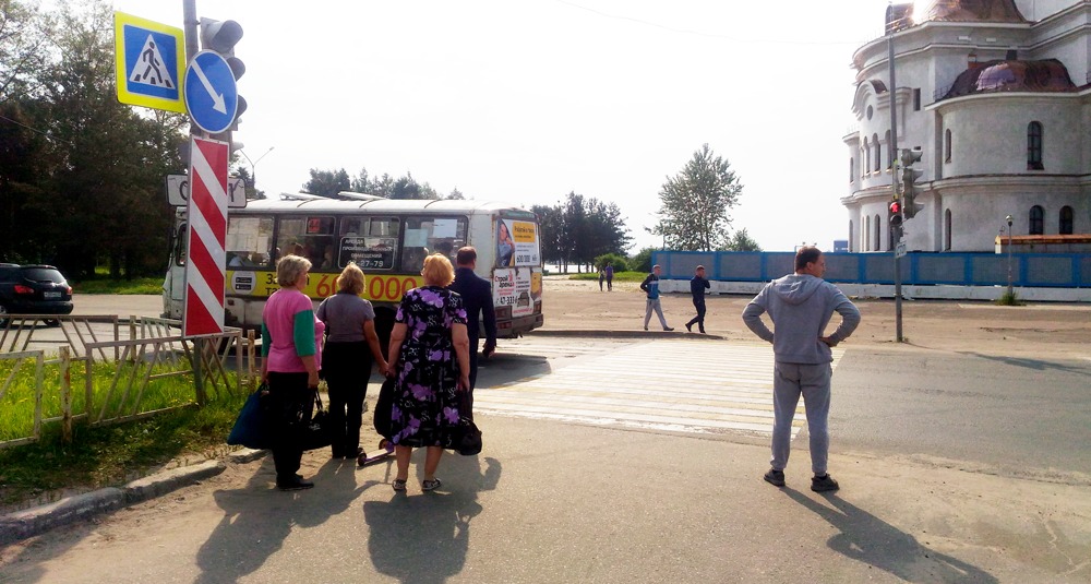 В Архангельске, на пересечении наб. Северной Двины и ул. Выучейского, есть примечательный пешеходный переход. Примечателен тем, что переходить его приходится в два захода, или перебегать в один.