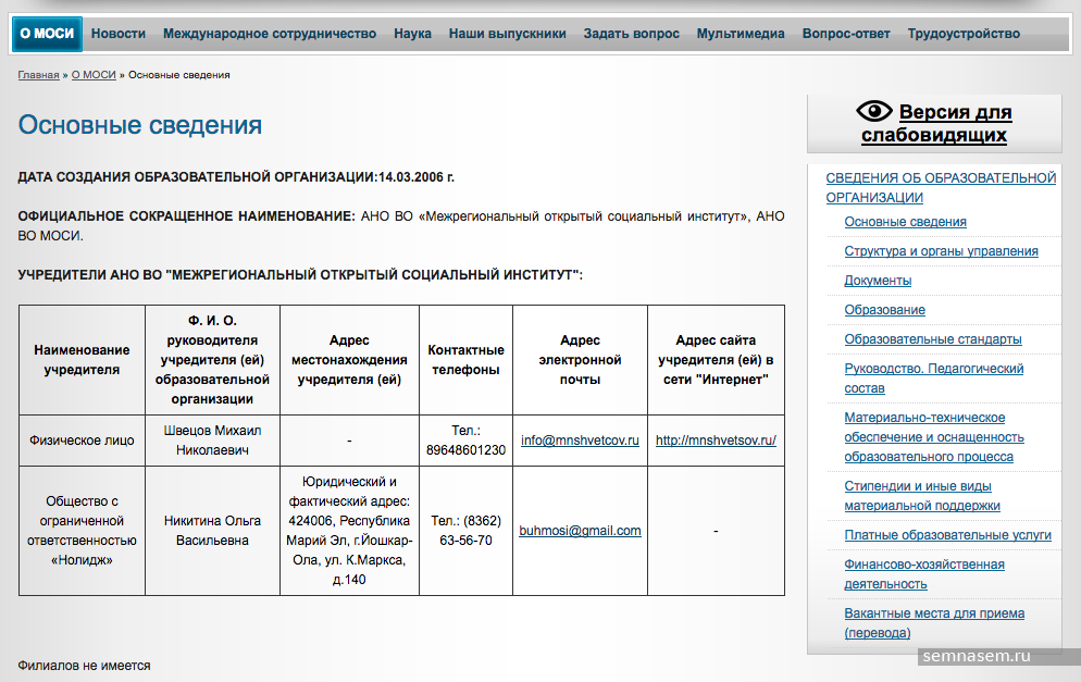 На сайте также указано, что учредителем МОСИ является ректор Марийского государственного университета (МарГУ), сын экс-министра образования Марий Эл Михаил Швецов и ООО «Нолидж».