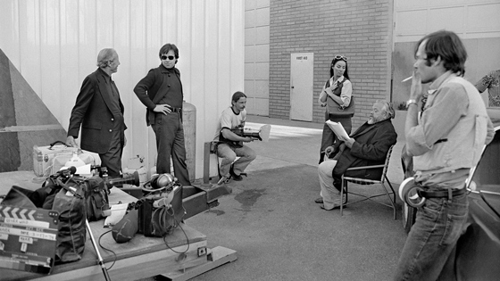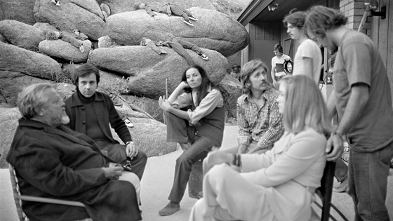 © Netflix На съемках фильма «Другая сторона ветра» Съемки начались в 1970-м и продолжались около шести лет, спорадически останавливались и возобновлялись. Уэллс умел использовать свое сокрушительное обаяние и легендарный статус: юные синефилы и кинематографисты готовы были работать на него бесплатно. Так же и вокруг Джейка Ханнафорда вьется стайка молодых лицемеров — студентов, критиков, режиссеров, по сюжету приехавших поздравить классика с днем рождения. (Напомню: Уэллс утверждал, что фильм не автобиографический.) На несколько лет «Другая сторона» вдруг оказалась главным делом жизни не только для ее режиссера, но и для Грэвера, а также, например, продюсера Фрэнка Маршалла и Богдановича. Последний — киновед и модный постановщик, протеже Уэллса — в «Другой стороне ветра» сыграл одну из ролей (а потом и еще одну), а также занимал на площадке должность, расплывчато называемую «координатор». Богданович, в 1968 году выпустивший полнометражный дебют «Мишени», боготворил Уэллса еще со студенческих времен, тот благосклонно принимал восхищение молодого коллеги; в частности, в какой-то момент фактически поселился в его доме.