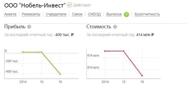 Еще одно «совпадение» – это плачевное финансовое состояние «Нобель-Инвест». Тут ситуация обратная. С 2014 года прибыль была близка к нулю, в 2016 г. она рухнула до почти полумиллиона убытков, но компания при этом стоит 414 млн. рублей! То есть компания денег не приносит, но при этом стоит почти миллиарда!? Как-то странно ведут счет в компаниях, связанных с Гуревичем.