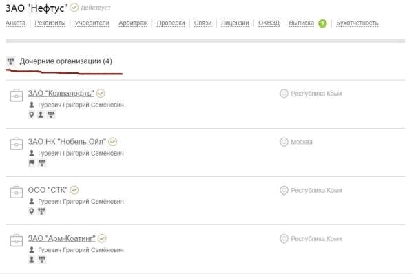 Но и тут есть интересная деталь. По юридическому адресу, где зарегистрирована «Колванефть» – 169711, Республика Коми, город Усинск, Парковая улица, д. 5б располагается другая компания, связанная с нефтью, которой также руководит Гуревич – ЗАО «Нефтус». Убытки этой компании в 2016 году составили 347 миллионов рублей! При этом «Нефтус» является головной компанией для ЗАО «Колванефть», ЗАО НК «Нобель Ойл» и еще двух компаний Гуревича.