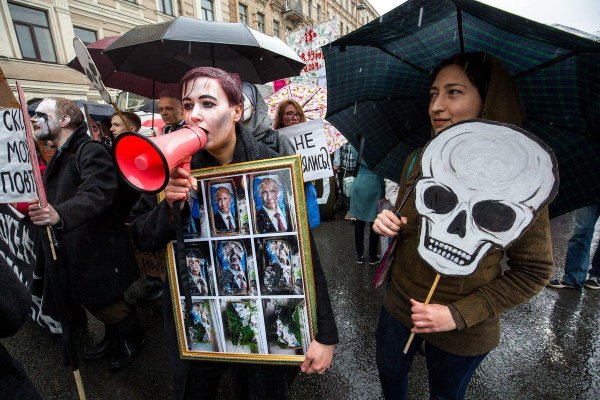 Михайлова несла «Девять стадий разложения вождя», когда шла в колонне Партии мертвых на первомайском шествии.
