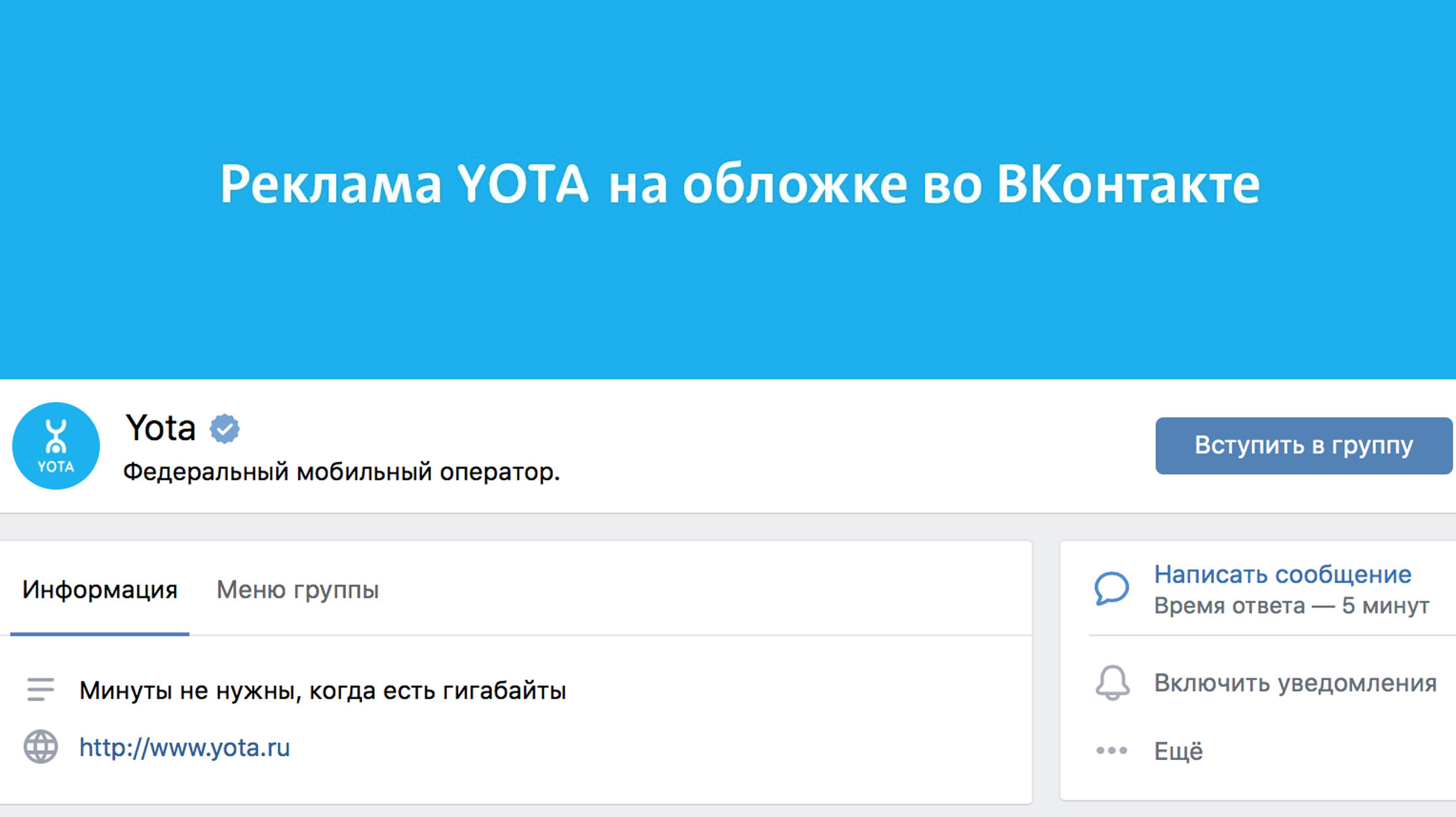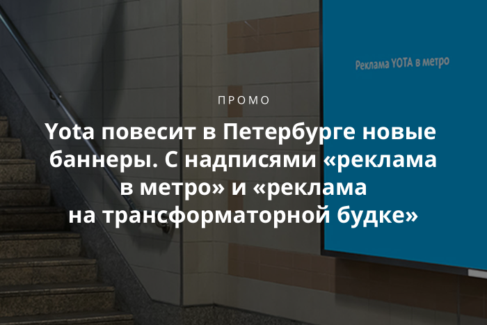 Мобильный оператор Yota разместит в Петербурге баннеры с надписями «Реклама Yota в метро» и «Реклама Yota на трансформаторной будке». В сети уже появились баннеры «Реклама Yota на обложке во ВКонтакте» и «Реклама Yota в ролике в интернете».