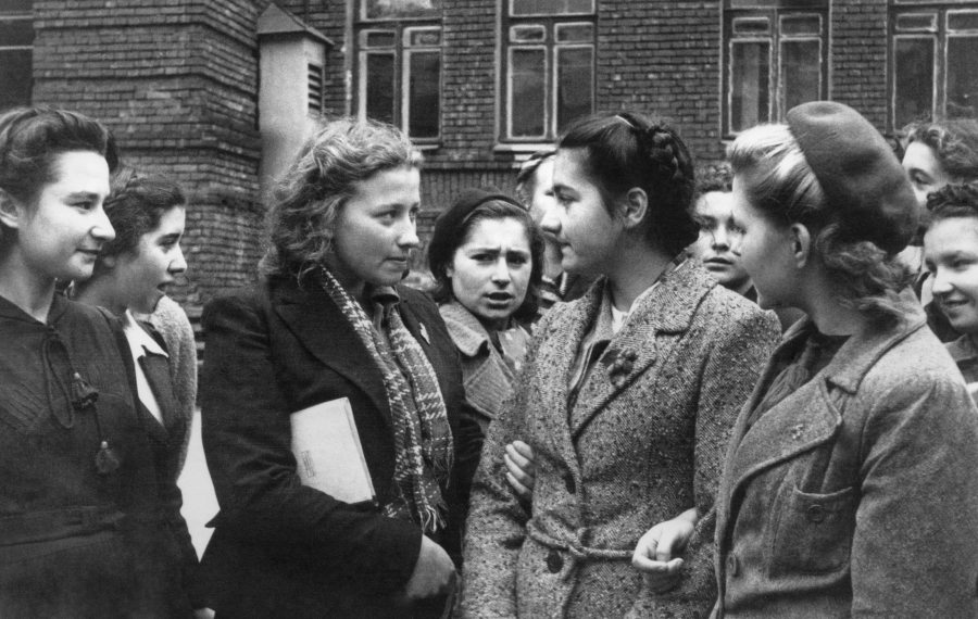 1 сентября 1952 года в женской школеФото: Давид Шоломович/РИА Новости И была фантастическая немка, которая ухитрилась после войны заставить нас полюбить немецкий язык. Прелестная совершенно — выглядела как писательница Анна Зегерс, то есть такая мужеподобная, с большими ножищами, суровая, но нежнейшей души. Мы учили наизусть Гейне и Гете, стихи и прозу. Наша Гульда могла поставить два с плюсом или единицу с минусом.