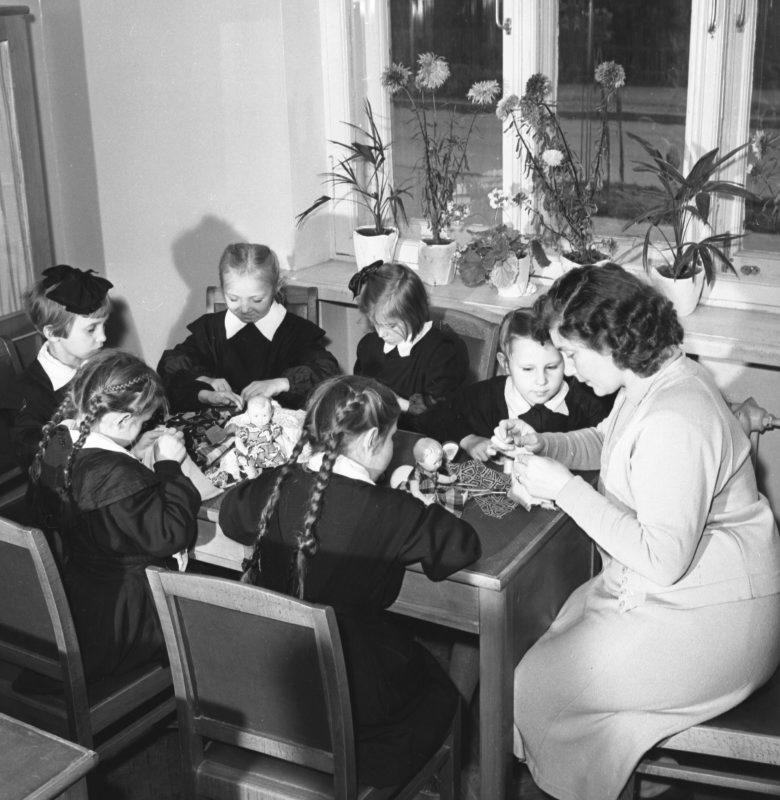 1951 год. Рижский район Москвы. Ученицы первого класса школы продленного дня во время занятий в кружке рукоделияФото: Яков Берлинер/РИА Новости Но потом как-то перестали общаться с мальчиками — почему, не понятно, видимо, женская школа все-таки накладывала отпечаток. А в десятом классе одна из наших одноклассниц родила. И мы, естественно, шушукались, нам интересно было, что там эта Света, это самое, того-сего, а Нина Михайловна, классная дама, пришла с букетом тюльпанов и торжественно сказала: «Девочки, я вас поздравляю, это наша первая мама!» Пока она беременная была, мы как-то не знали, то ли на каникулы пришлось, то ли отсутствовала будто по болезни. Никто особенно не вникал же, ну болеет и болеет, одна девочка так и вовсе умерла, время ж тяжелое было. А мы были такие дохлые — кто худющий ужасно, кто с нездоровой полнотой, кто ненормально маленького роста, одна с костылем ходила, вроде бы у нее был костный туберкулез.