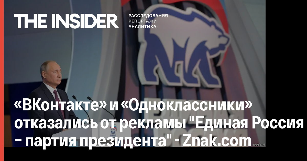 Соцсети «ВКонтакте» и «Одноклассники» отказались размещать агитацию «Единой России» где она названа «партией президента». Об этом сообщает Znak.com со ссылкой на источник в одном из региональных избирательных штабов.
