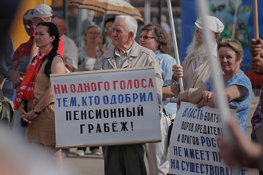 В Смоленске 2 сентября прошло два митинга против повышения пенсионного возраста и одиночный пикет. В сквере на улице Коммунистической собрались сторонники партии «Справедливая Россия», коммунисты митинговали у Киселевского рынка, а на трамвайную остановку «Площадь Победы» с одиночным пикетом вышел художник Андрей Демьянов «Рус». На этих акциях побывал корреспондент «7x7».