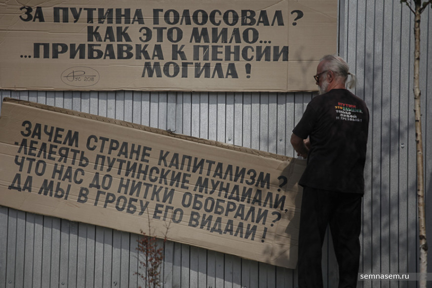 Это вышел на одиночный пикет 67-летний смоленский художник Андрей Демьянов, подписывающий свои работы «Рус». По его словам, он постоянно проводит пикеты, «когда есть какая-то тема», и уже имел проблемы с центром по борьбе с экстремизмом, но суд признал законность действий художника. На эту акцию он вышел, узнав, что 2 сентября — всероссийский день протеста против повышения пенсионного возраста. После пикета на «Площади Победы» Андрей Демьянов развесил свои плакаты на митинге коммунистов.