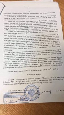 Кассационную жалобу на решение Дорогомиловского районного суда об аресте Марии Дубовик в Верховный суд подал ее адвокат Максим Пашков. Судья Верховного суда в свою очередь передал жалобу на рассмотрение президиуму Мосгорсуда.