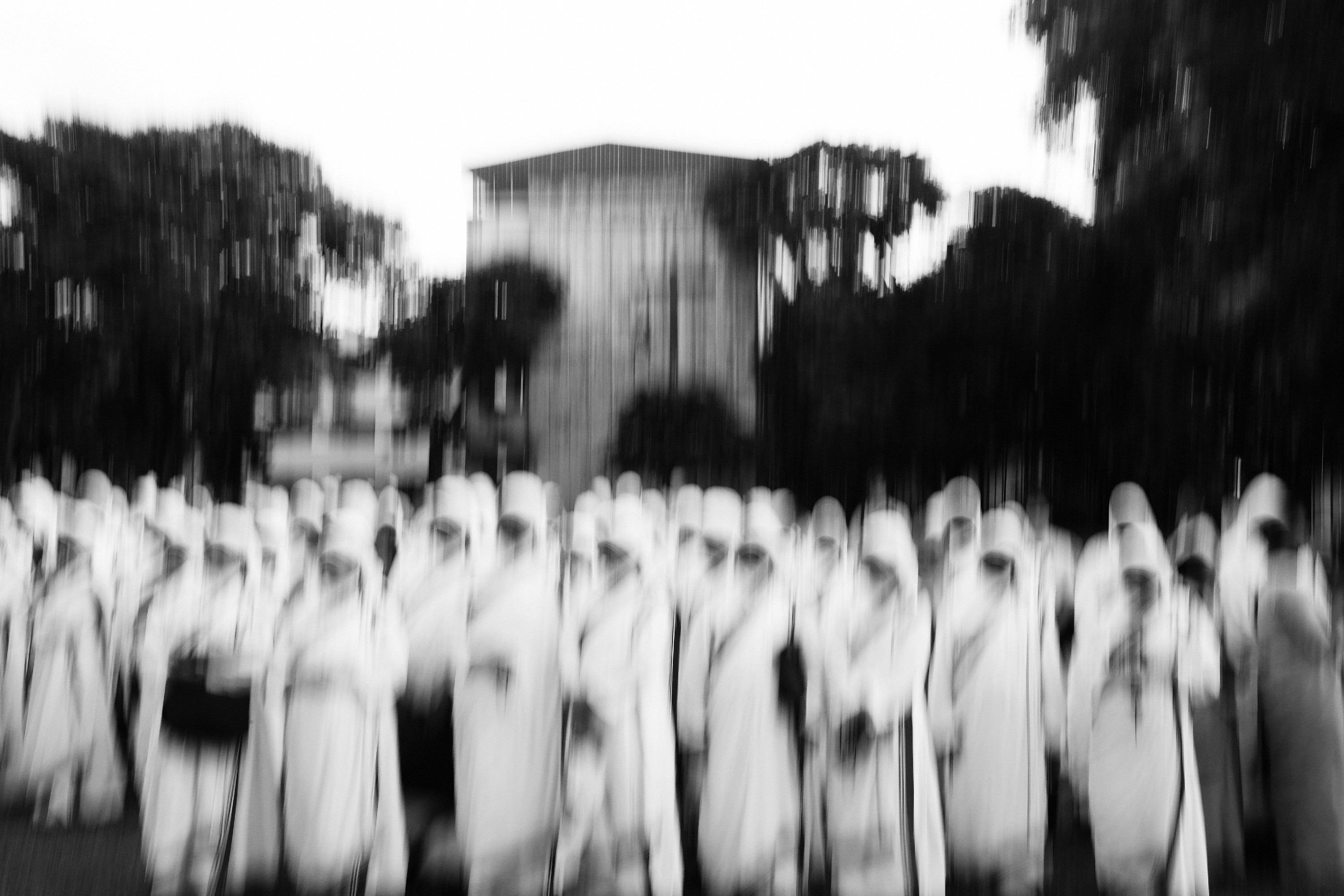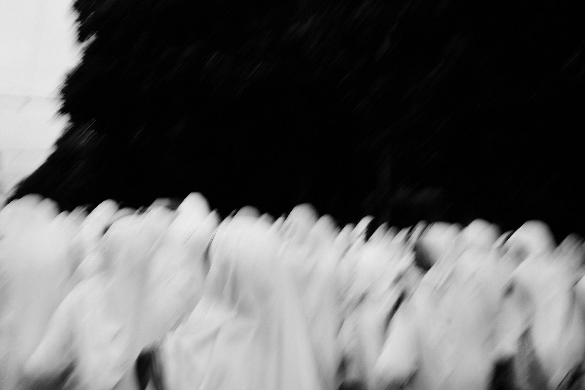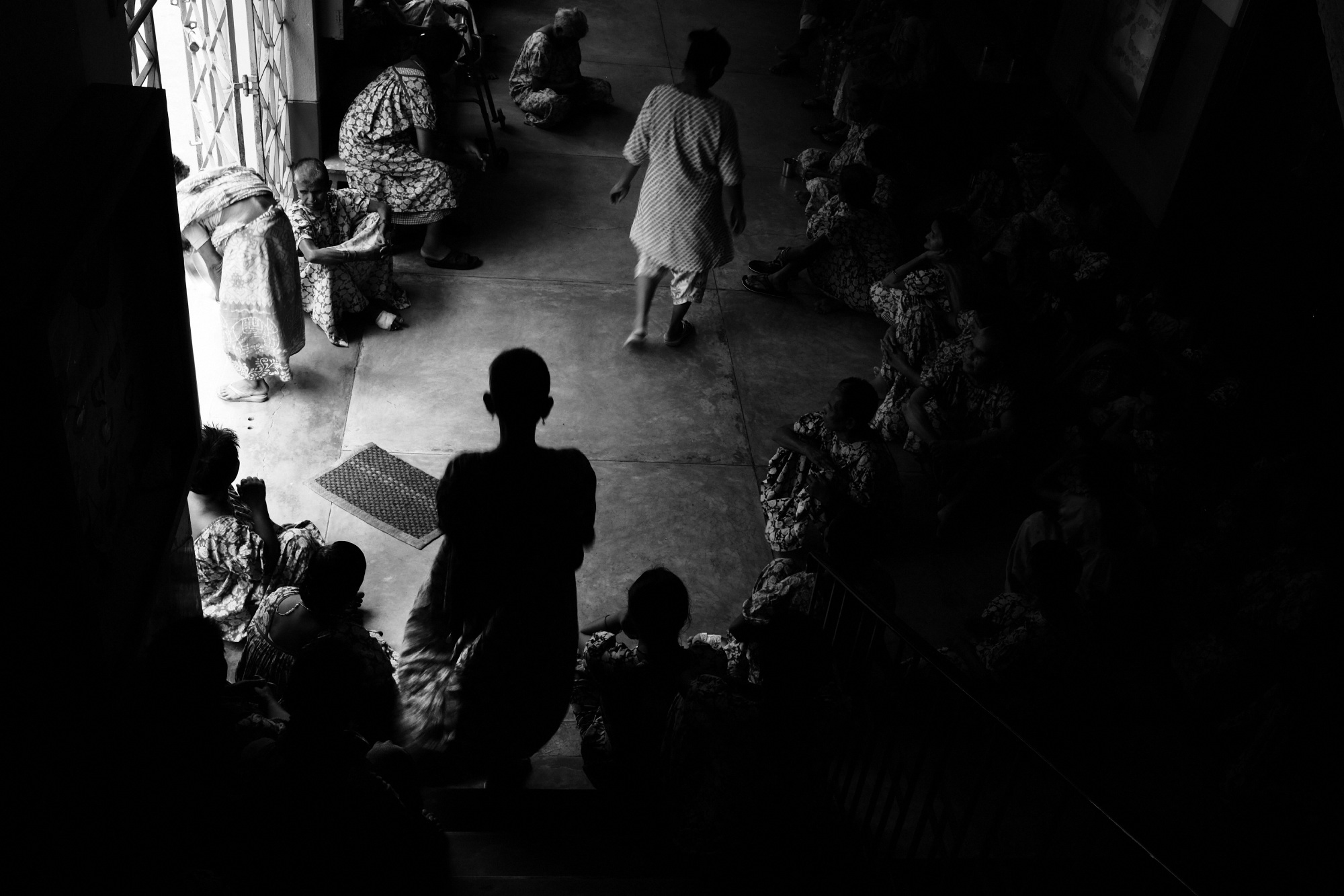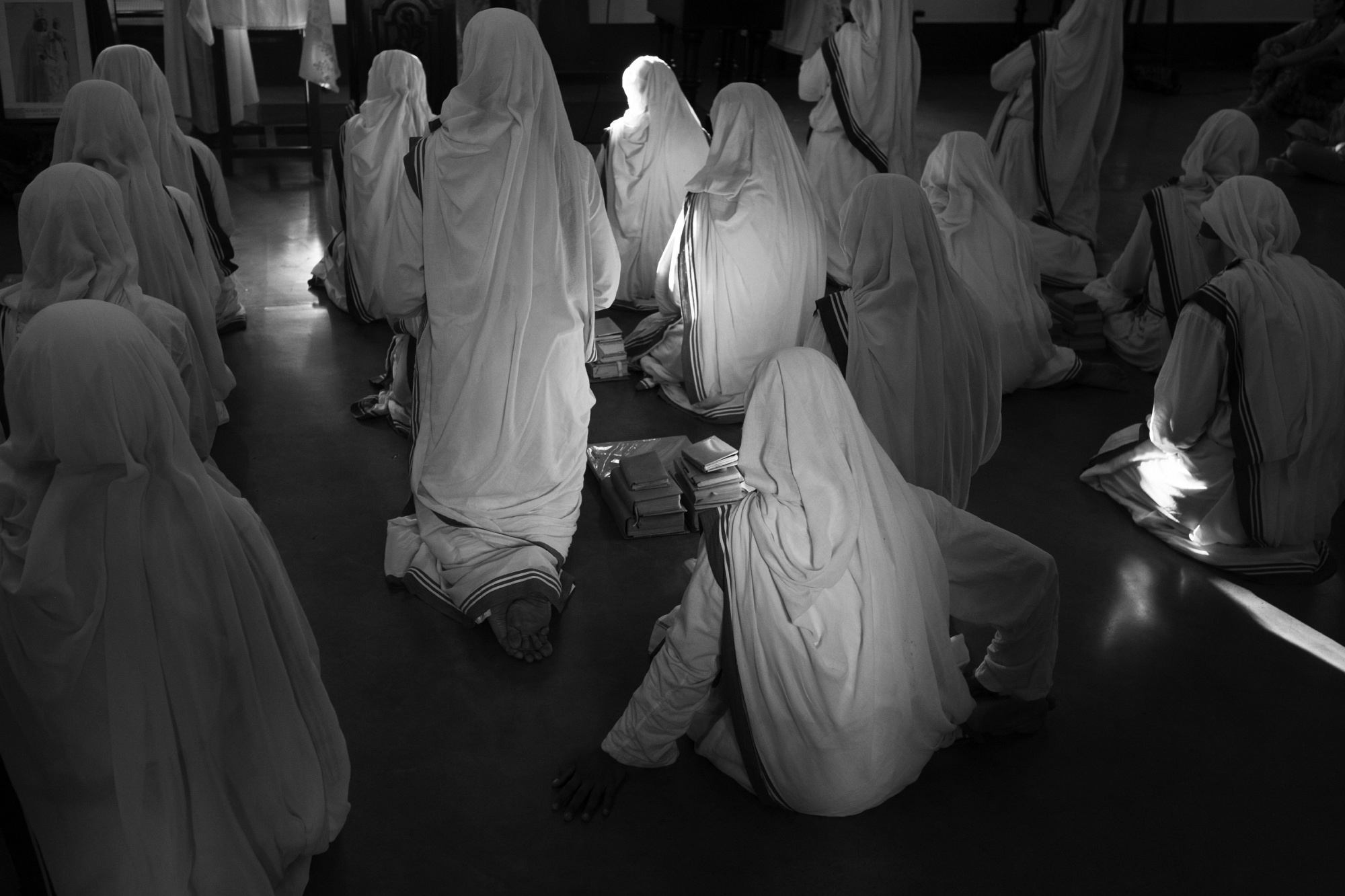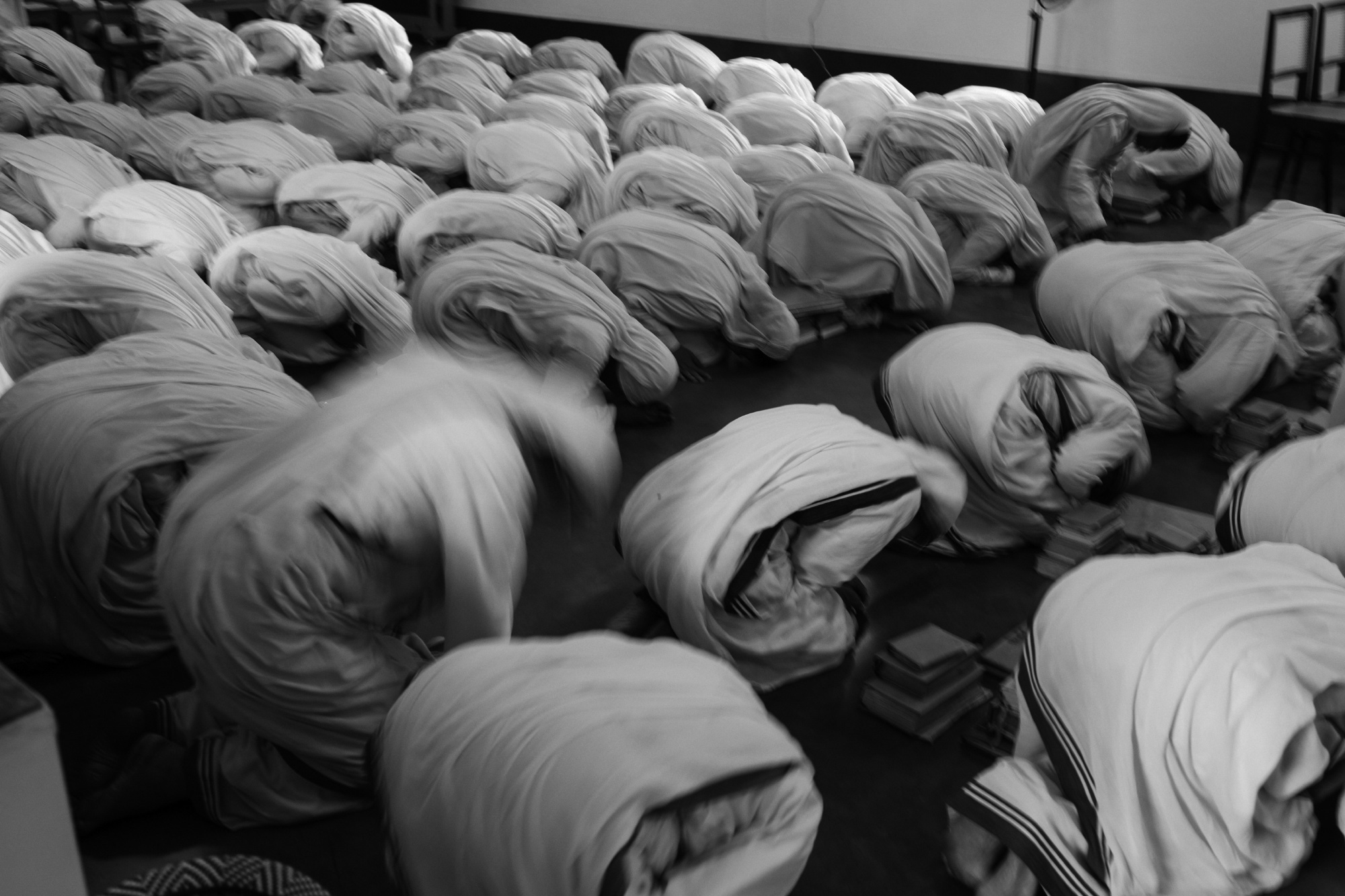 Утренняя молитва в доме милосердия. Все сестры одеты одинаково — в нехарактерное для прочих монашеских конгрегаций белое одеяние, напоминающее индийское сари. Сестры приезжают в Калькутту из разных уголков мира, от Африки до некоторых стран постсовесткого пространства. Возраст их разнится от 18 до 70, а разговаривают между собой сестры по-английски