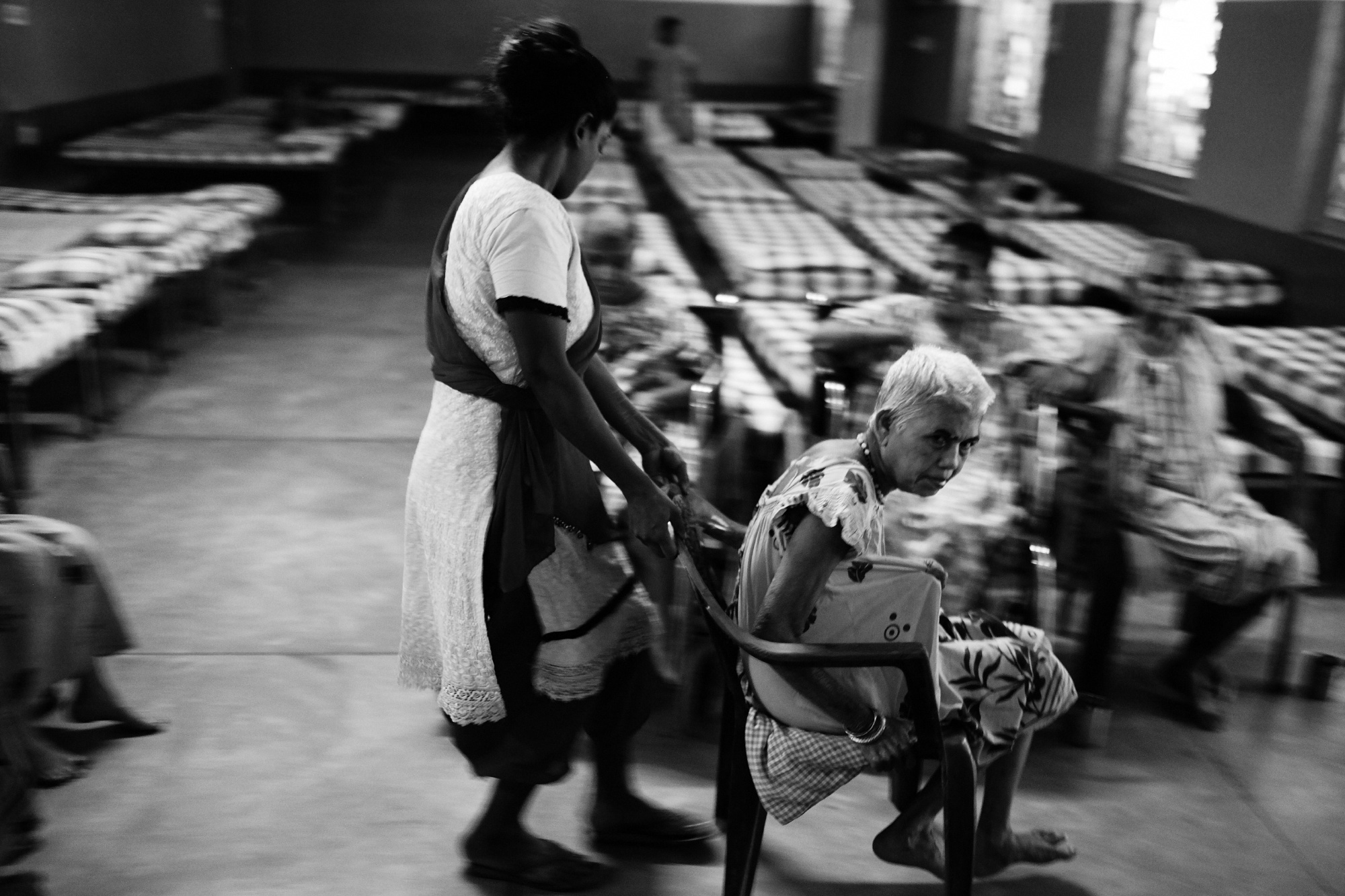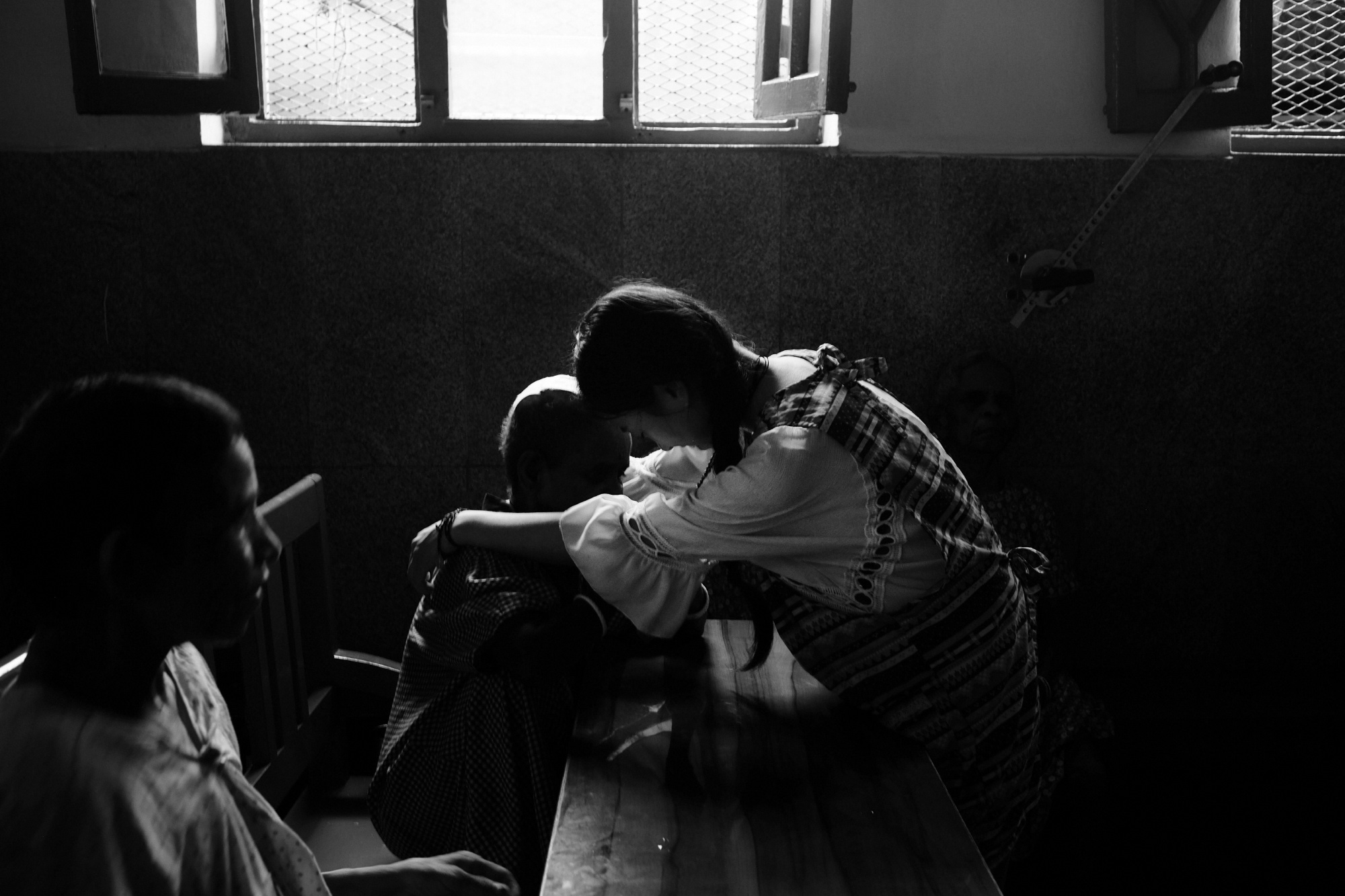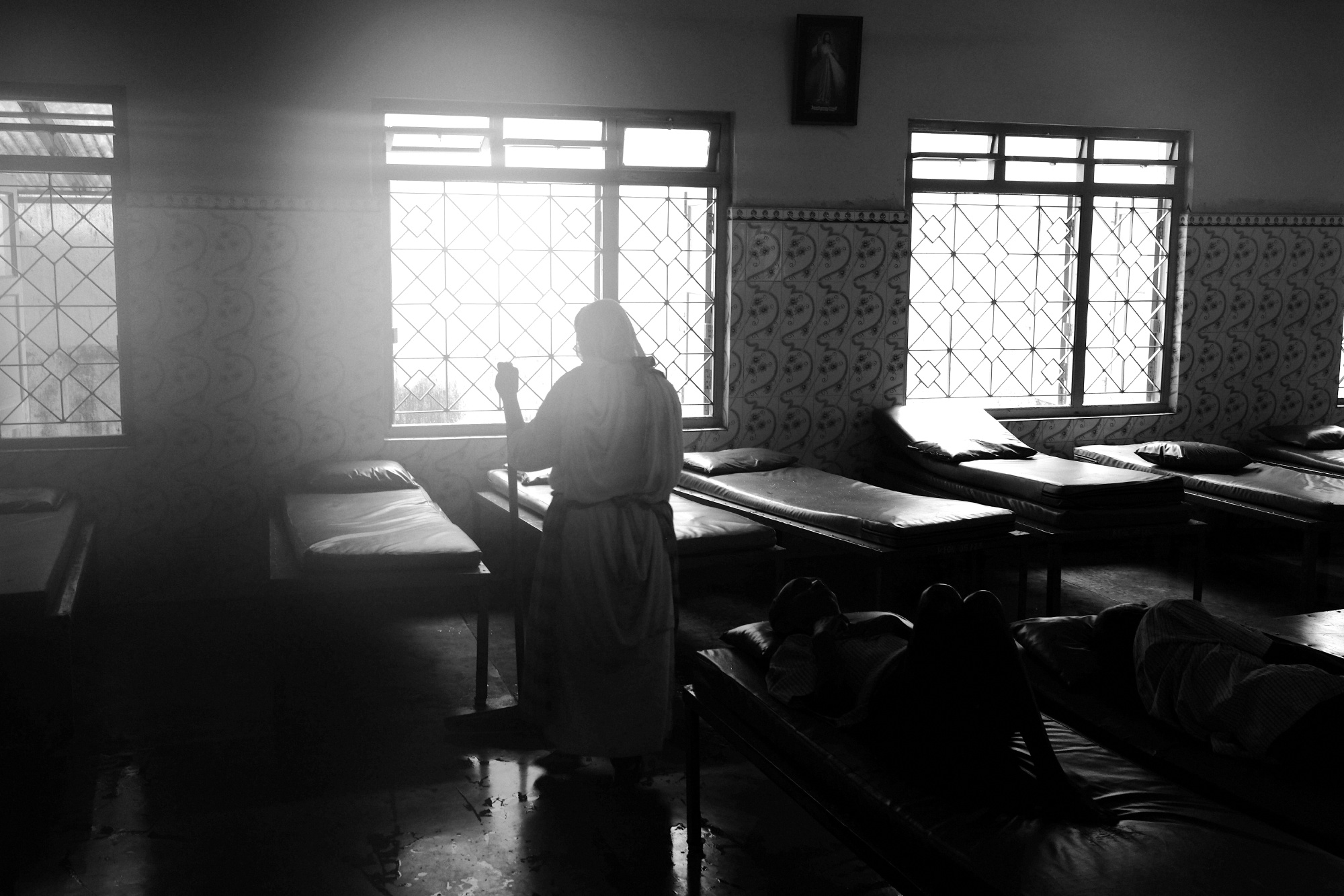 Сестра проводит время с онкобольной в палате. Гладит, помогает заснуть, поет песни шепотом. Многих стариков, поступивших в хосписы, сестры нашли на улице в полной нищете. Их дети забыли и бросили их. Внимание молодых сестер успокаивает больных