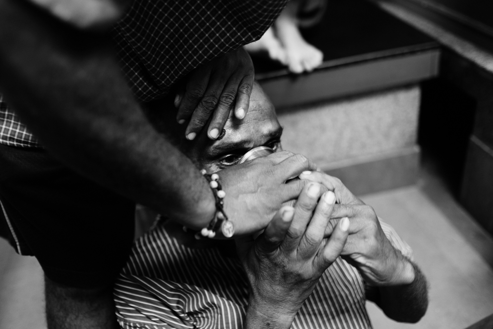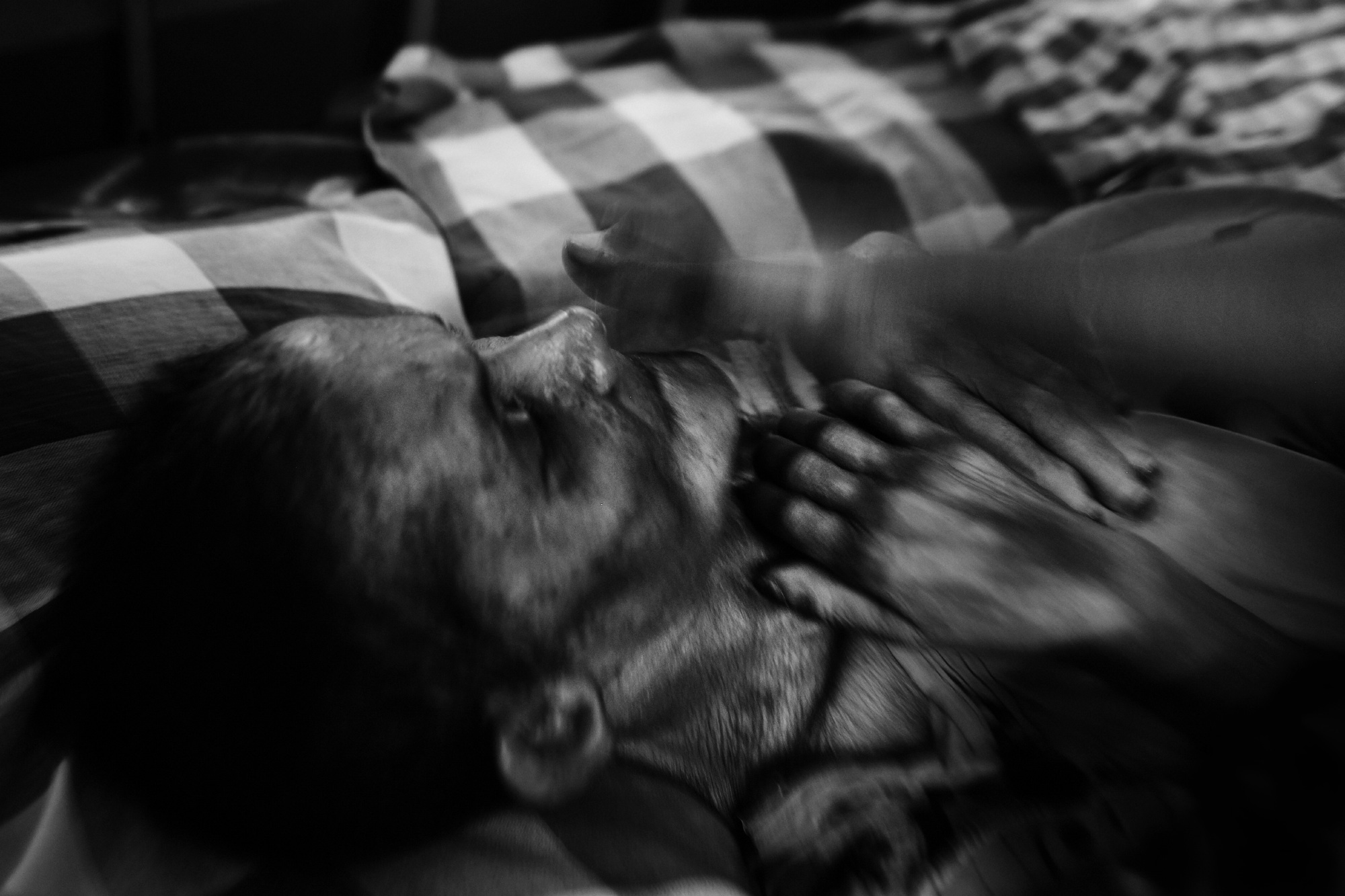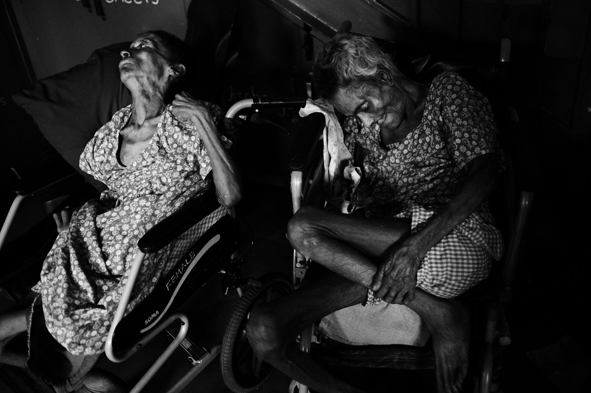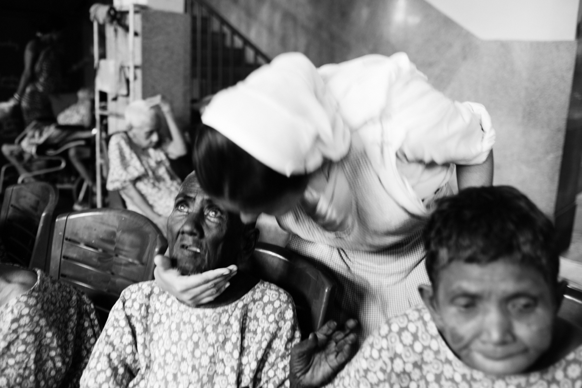 Сестра проводит время с онкобольной в палате. Гладит, помогает заснуть, поет песни шепотом. Многих стариков, поступивших в хосписы, сестры нашли на улице в полной нищете. Их дети забыли и бросили их. Внимание молодых сестер успокаивает больных