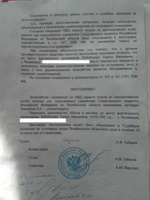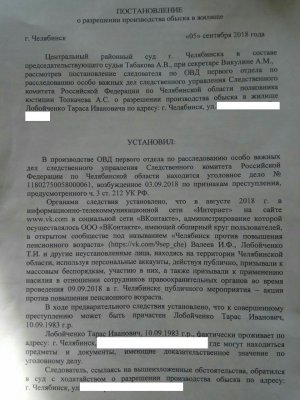 сообщаетЧиков опубликовал копию постановления Центрального районного суда Челябинска о разрешении обыска у Тараса Лобойченко в рамках дела по третьей части статьи 212 УК.
