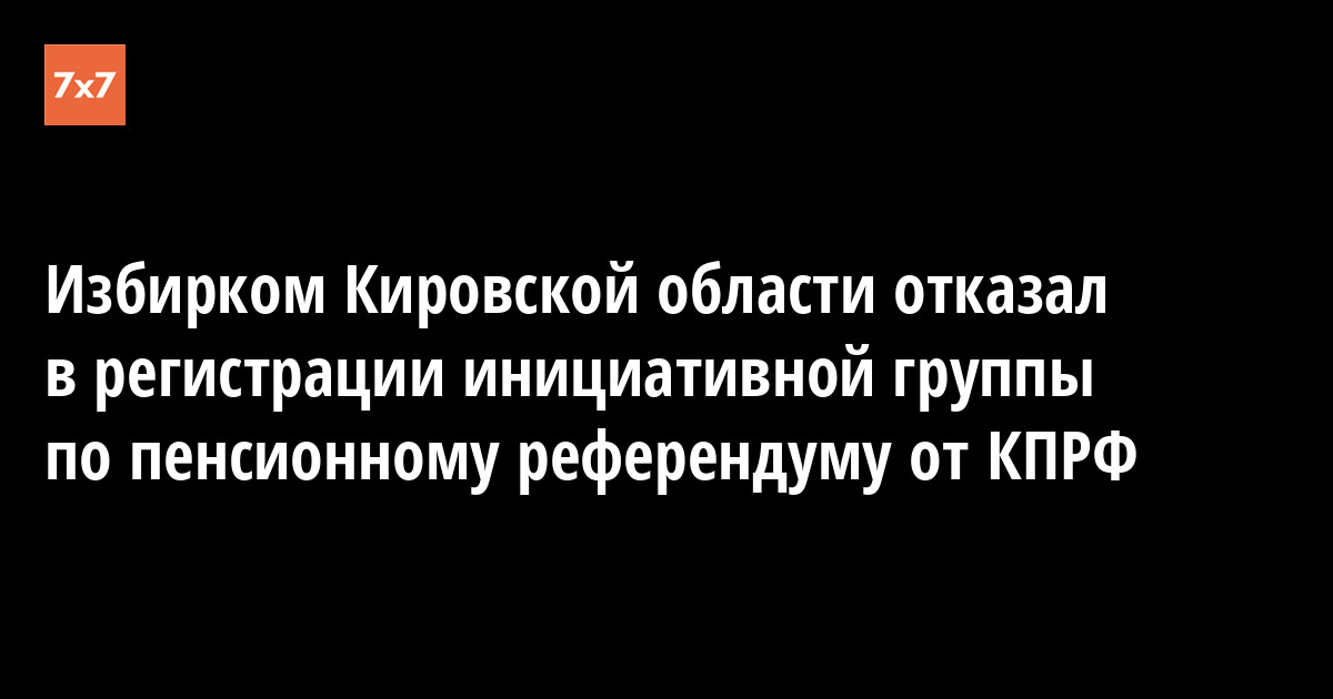 Инициативная группа КПРФ по проведению референдума о повышении пенсионного возраста получила отказ в регистрации в Кировском облизбиркоме 6 сентября. Об этом «7x7» сообщил пресс-секретарь регионального отделения партии Александр Маратов.