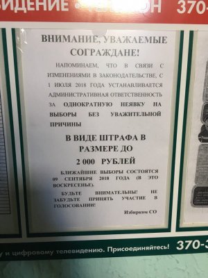 В объявлении указано, что «в связи с изменениями в законодательстве с 1 июля 2018 года устанавливается административная ответственность за однократную неявку на выборы без уважительной причины в виде штрафа в размере до 2000 рублей». О каких именно изменениях в закондательстве идет речь — не уточняется.