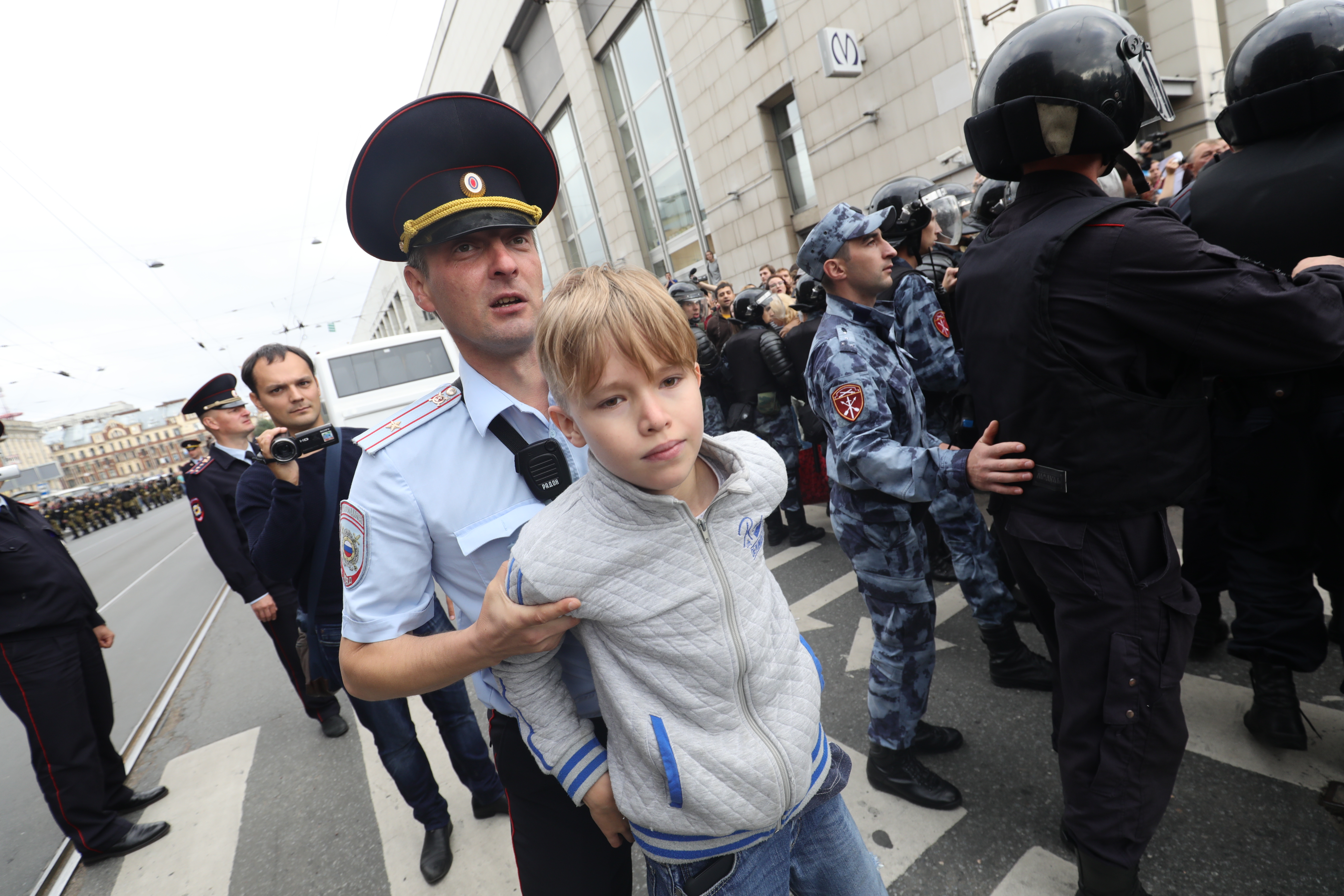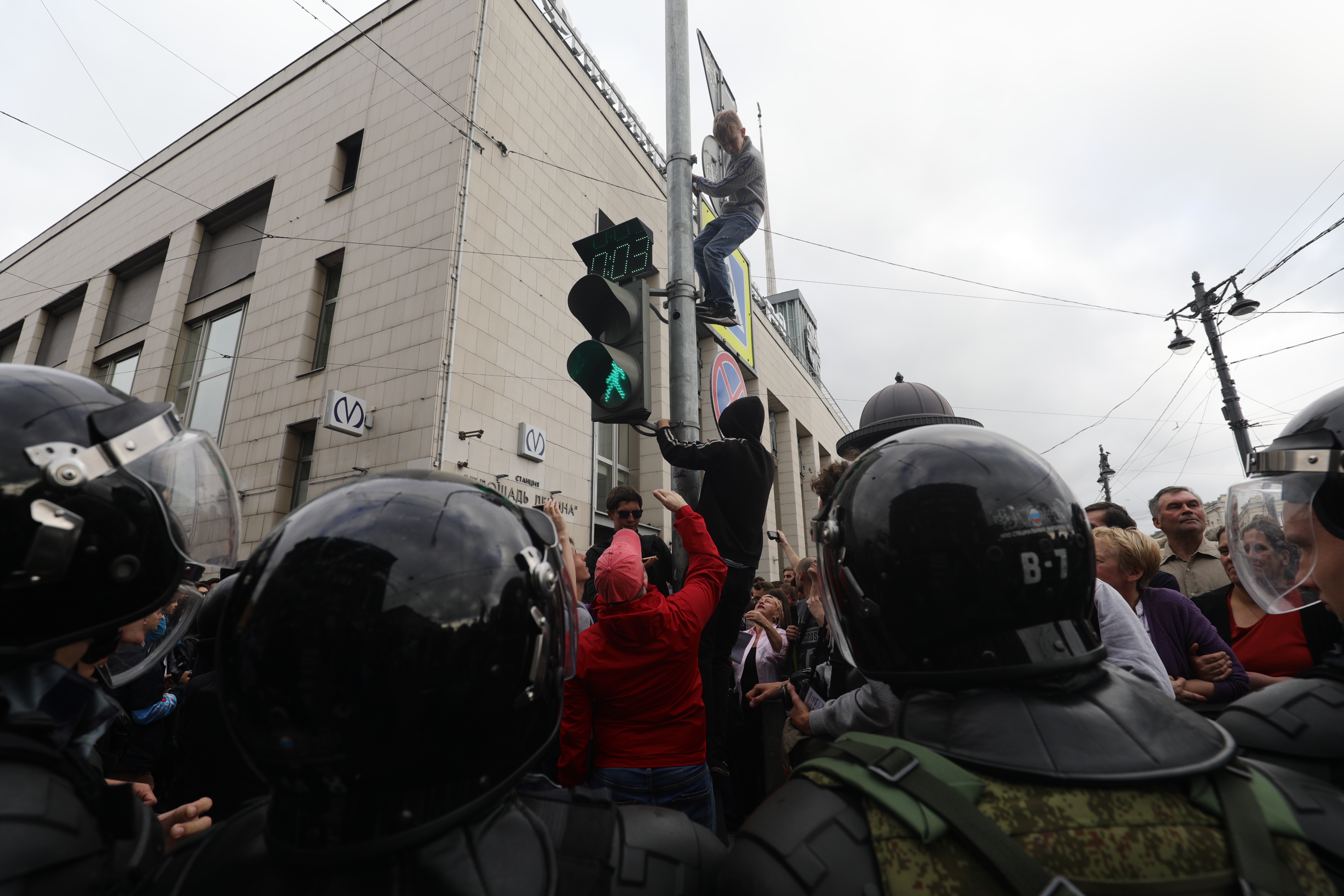 Полиция и демонстранты вместе уговаривают ребенка слезть с фонарного столба.