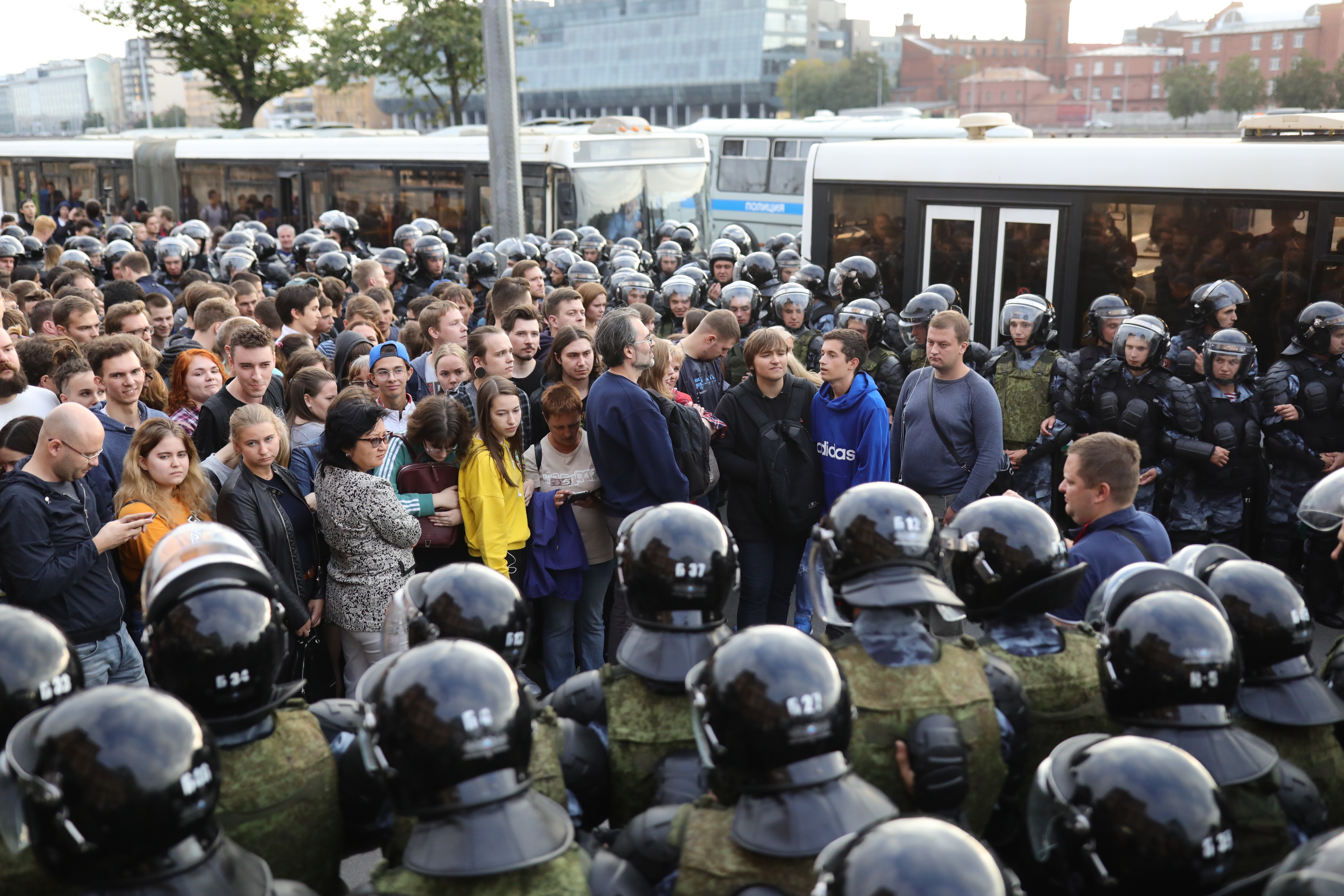 Полиция окружила всех оставшихся участников шествия и по очереди отводит их в автобусы.