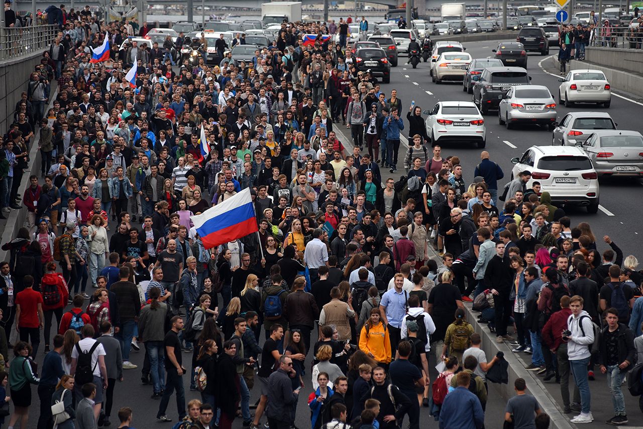 Толпа вышла на Пироговскую набережную и прямо по проезжей части пошла в сторону «Авроры» под сигналы проезжающих мимо машин. Непонятно было — то ли водители приветствовали акцию протеста, то ли возмущались внезапно возникшей пробкой.