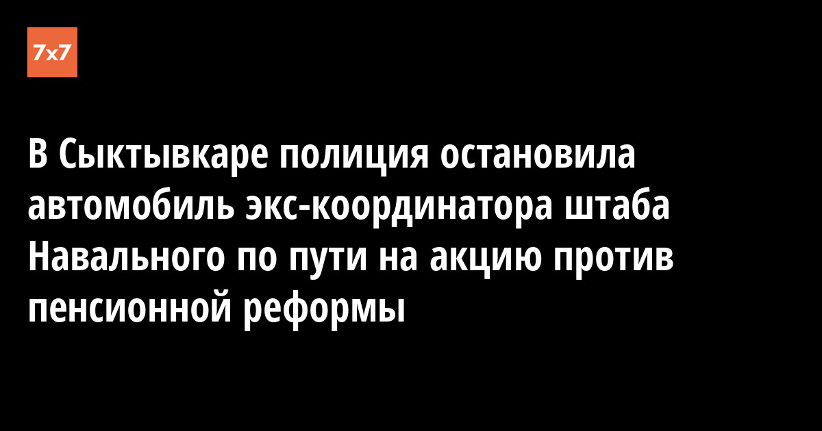 Экипаж сыктывкарской Госавтоинспекции днем 9 сентября остановил автомобиль экс-координатора штаба Алексея Навального Анатолия Мишарина. Он направлялся на акцию против повышения пенсионного возраста на площадке у городского бассейна и на Театральной площади. До этого сторонник оппозиционного политика вместе с юристом Андреем Ивашовым дежурили возле здания УМВД по Сыктывкару — они собирались оказывать юридическую помощь участникам акции, если полиция решит их задержать. Об этом корреспонденту «7x7» рассказал сам Анатолий Мишарин.