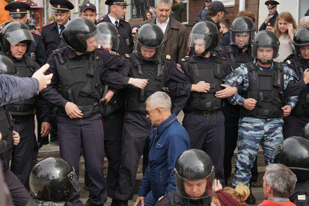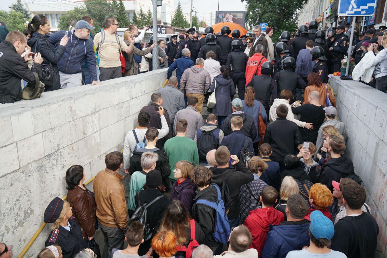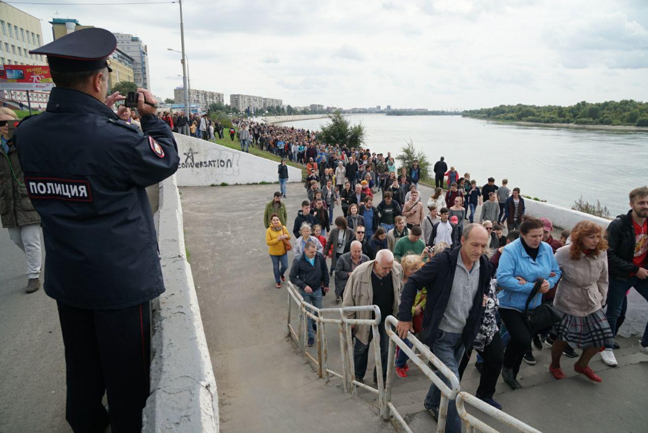 Задерживать стали примерно за час до того, как началось само мероприятие – организованный омским штабом Навального митинг-шествие против повышения пенсионного возраста. К двум часам в точке сбора – у магазина "Океан" на Иртышской набережной – находилось, по словам очевидцев, от 1500 до 2000 человек. Однако большая часть людей довольно быстро покинула мероприятие, увидев, что полиция в этот раз настроена серьезно. Те, кто посмелей, двинулись по набережной к центру города. Уже там, в центре, толпу удалось разделить. Чуть позже в подземном переходе около Театральной площади, где предполагалась конечная точка маршрута, случилась давка из-за того, что ОМОН перегородил выход. Если по ходу движения колонны полицейские "выхватывали" из толпы только тех, кто скандировал лозунги или нес плакаты, то здесь уже стали брать всех без разбора.