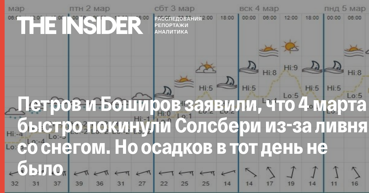 Согласно сводке погоды, никаких осадков 3 и 4 марта в Солсбери не было. Снегопад закончился 2 марта. Допустим, 3 марта в городе и правда еще мог лежать снег (хотя на фото его не видно), но 4 марта никакого «ливня со снегом», который якобы заставил россиян отказаться от планов, не было: