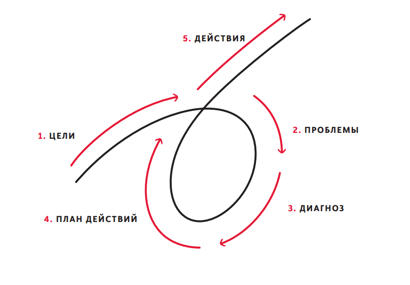 Для достижения успеха вам придется качественно выполнять каждый из этих шагов и каждый раз в установленной последовательности. Так, когда вы выбираете цели, сосредоточьтесь на их формулировке. Не думайте о том, как вы их достигнете или что будете делать, если что-то пойдет не так. Когда вы диагностируете проблемы, не думайте о том, как будете их решать, просто диагностируйте. Размывание этих этапов ведет к снижению качества результатов, потому что мешает выявлению настоящих проблем. Это цикличный процесс: качественное выполнение каждого шага снабжает вас информацией, необходимой для перехода к следующему этапу и качественному его выполнению.
