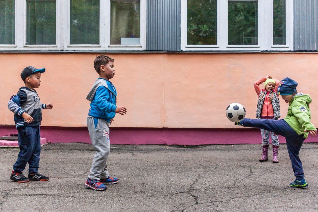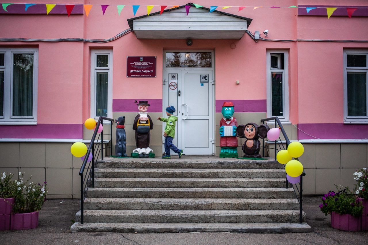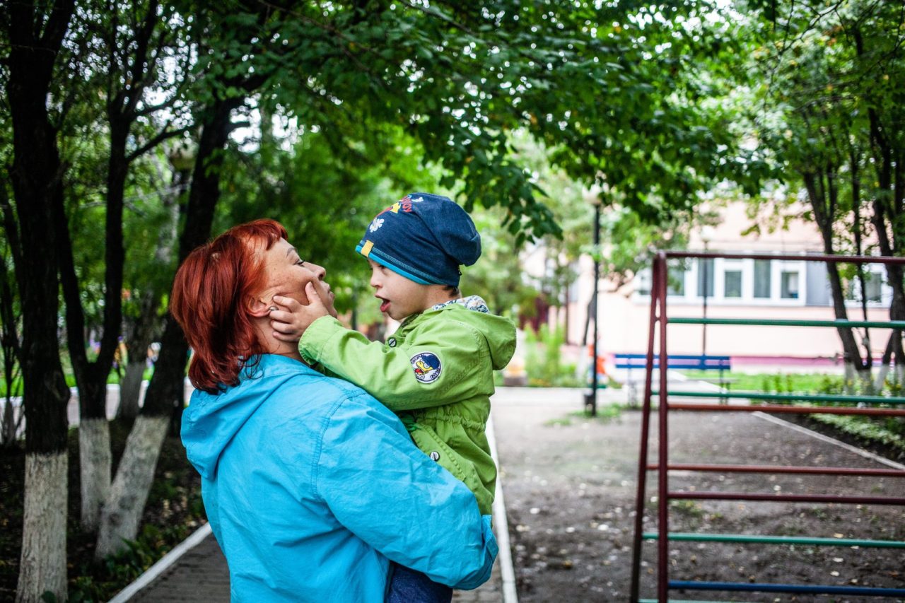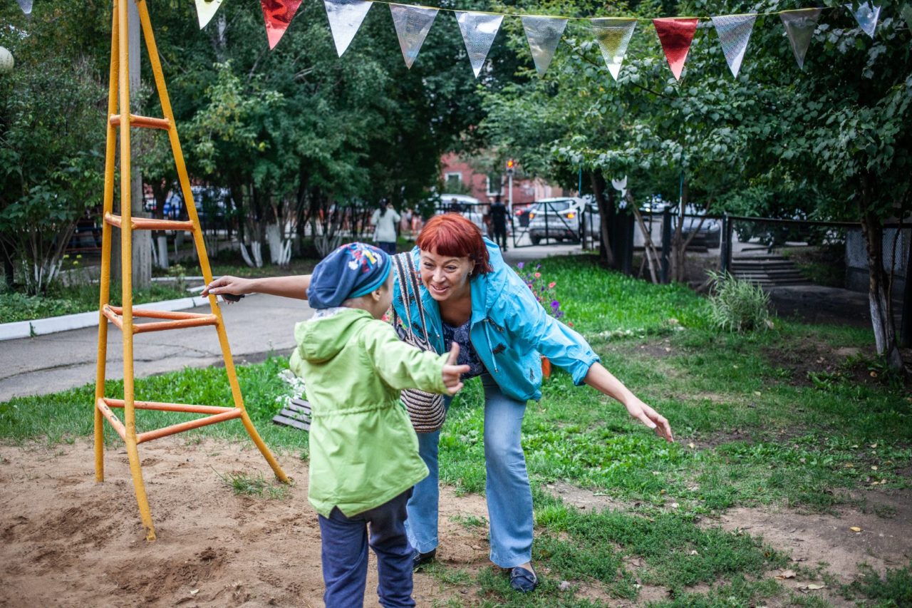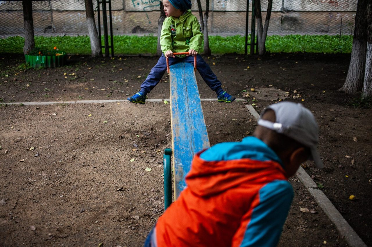 Миша на игровой площадке детского садаФото: Антон Климов для ТД «Радуга» открыла в Иркутске центр «Моя и мамина школа», где родители могут получить консультацию, поддержку и познакомиться друг с другом, если захотят. Специалисты «Моей и маминой школы» выезжают в роддома и разговаривают с родителями новорожденных с синдромом.