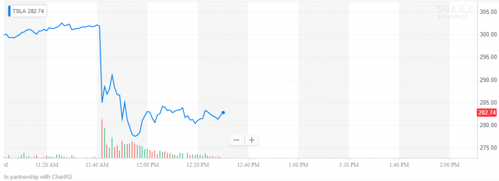 После новости о расследовании акции Tesla упали на 7,1%, затем курс скорректировался. Источник: Yahoo