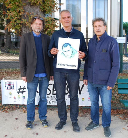Слева направо: режиссеры Крисоф Ружжиа, Лоран Канте, Эмманюэль Финкель у российского посольства в Париже. Фото: political.fr