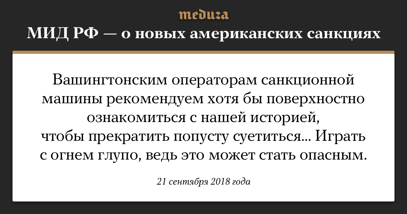 Заместитель главы МИД РФ Сергей Рябков заявил, что новые антироссийские меры США стали уже 60-ми по счету с 2011 года. По словам дипломата, введение санкций «превратилось в некую национальную забаву» в США. 20 сентября Госдепартамент объявил о внесении в «черный список» 33 российских граждан и компаний, связанных со сферами обороны и разведки России.