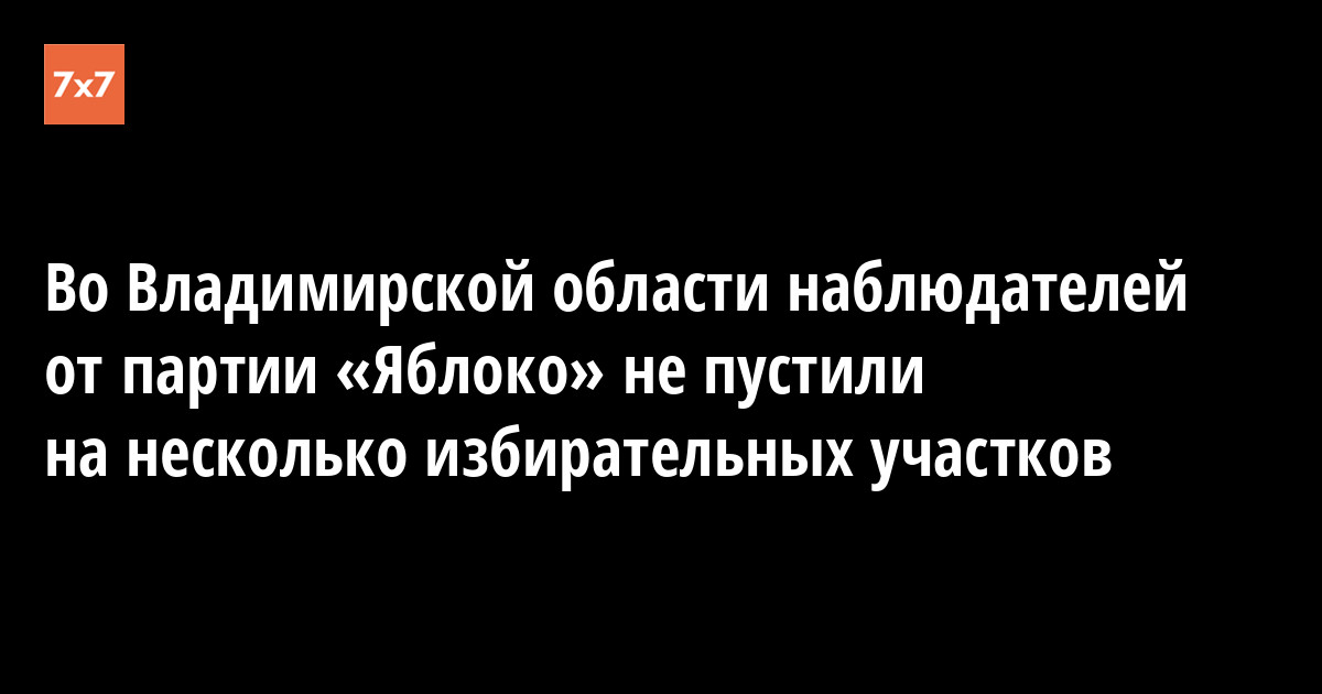 Наблюдатели от партии «Яблоко», зарегистрированные на второй тур губернаторских выборов во Владимирской области 23 сентября, сообщили «7x7», что председатели нескольких участковых избирательных комиссий запретили им находиться на участках под предлогом того, что кандидат «Яблока» не участвует во втором туре выборов. По их словам, разрешается наблюдать только от ЛДПР и «Единой России», кандидаты которых участвуют во втором туре.