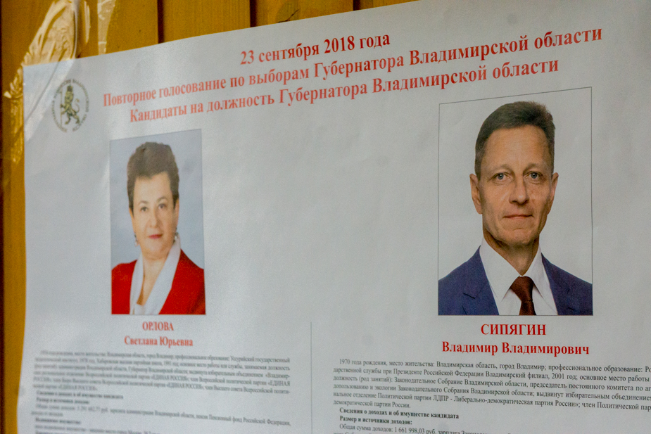 Первый тур губернаторских выборов во Владимирской области прошел 9 сентября. В нем участвовали пять кандидатов. Ни один из них не набрал больше половины голосов избирателей. Во второй тур прошли действующий губернатор Светлана Орлова и кандидат от ЛДПР Владимир Сипягин.