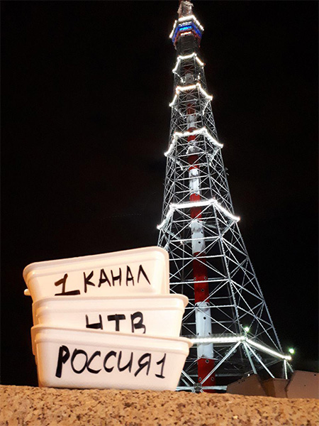 РС: Была акция против пропаганды со стороны СМИ, которую мы транслировали на YouTube. Стоял человек с плакатом «Нет пенсионному грабежу», к нему подходили три человека с лапшой быстрого приготовления — они символизировали «Первый канал», «Россию-1» и «НТВ» — и вешали человеку лапшу на уши, приговаривая цитаты вроде «Хочешь как на Украине?» В конце акции человек перевернул листовку, и там было написано: «Хочу работать до 65».